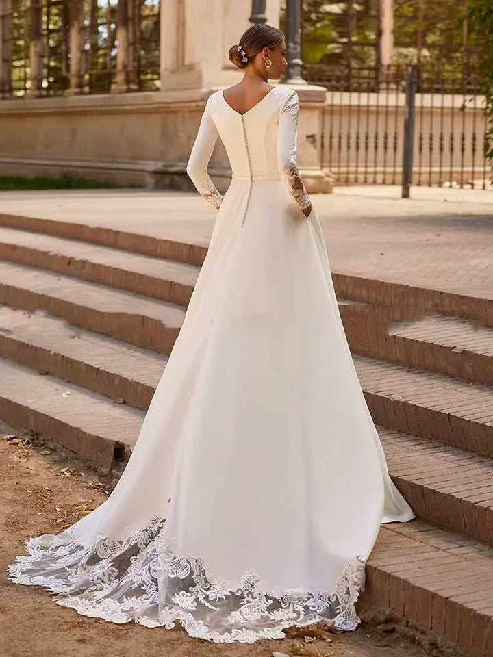 This elegant A-line wedding dress is designed for the modern bride looking for a modest yet stylish look. The flattering silhouette and classic design make it perfect for any wedding setting. Made with high-quality materials, this dress is both comfortable and timeless, making it a perfect choice for your special day.
