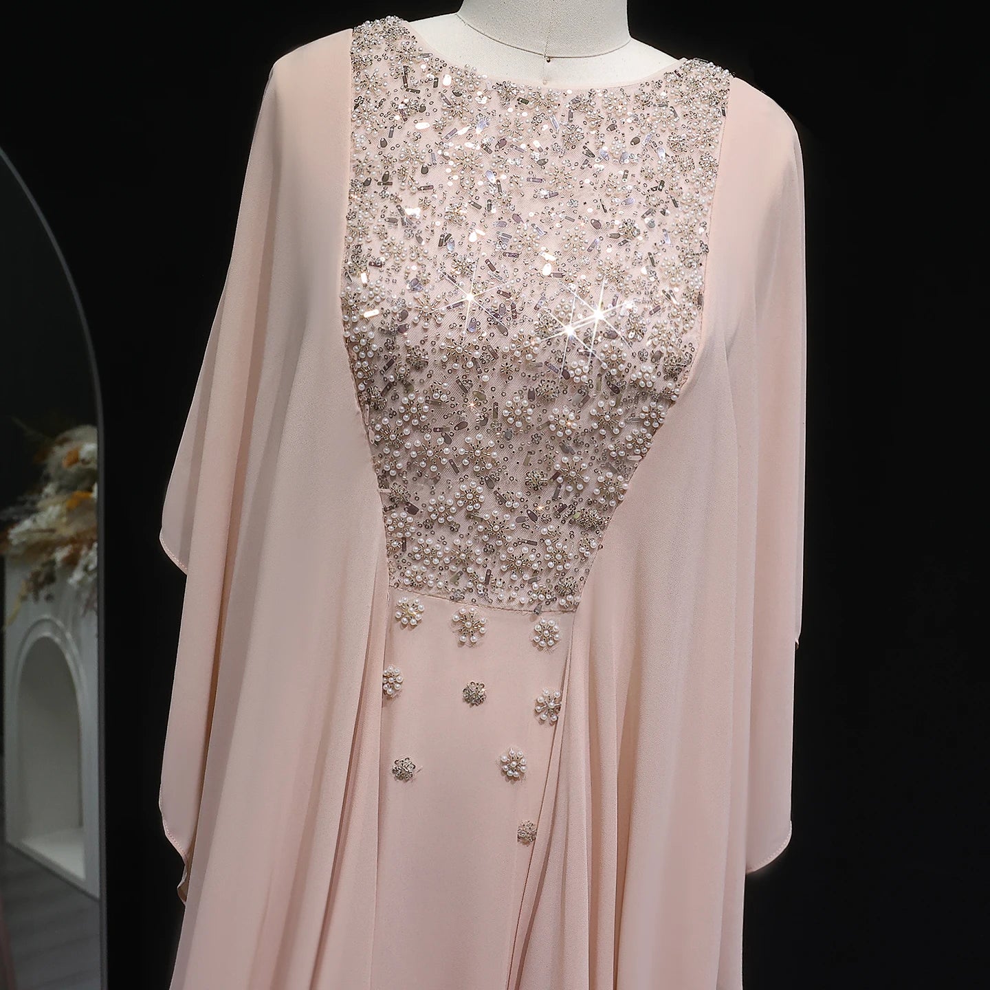 Elegant Ruffled Arabic Evening Dress-With Cape Sleeves