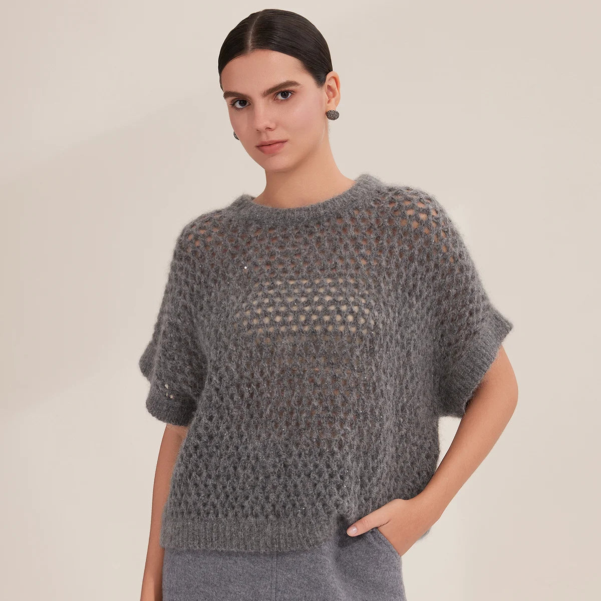 This stylish Mohair knit women's pullover sweater combines elegant texture with cozy warmth. Crafted from soft mohair fibers, it offers lightweight insulation and a luxurious feel against the skin. Its classic pullover design ensures effortless layering, making it a versatile addition to any wardrobe for expert-level comfort and sophistication.
