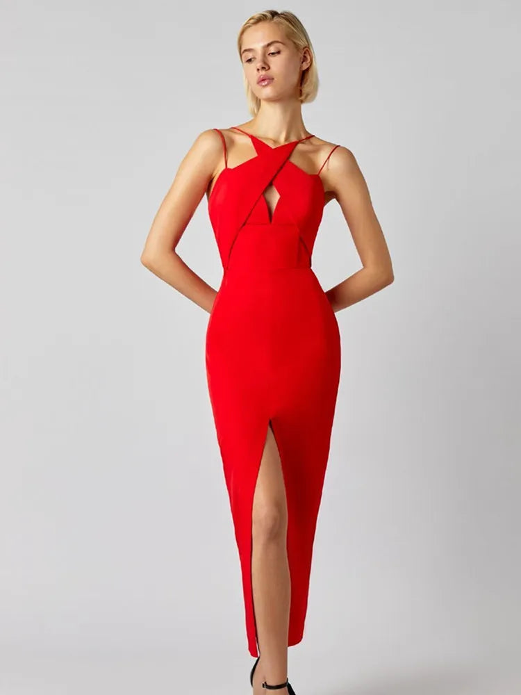 This luxury bandage dress features a split backless design for a modern and sophisticated look. Made with high-quality materials, it offers a comfortable and flattering fit. Elevate your style with this stunning midi dress.