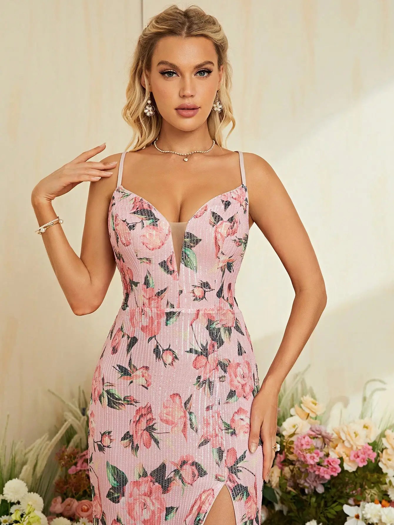 • Footwear: Go for strappy heels or elegant pumps to enhance the gown's dramatic slit.
