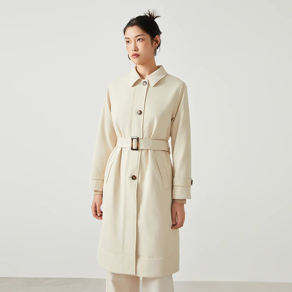 This women's trench coat combines classic style with modern comfort, crafted from a durable cotton blend for breathability and ease of wear. Its tailored silhouette offers a flattering fit, while practical details like a belted waist and buttoned cuffs enhance both function and elegance. Ideal for transitional weather, this coat provides versatile layering options without compromising on sophistication.