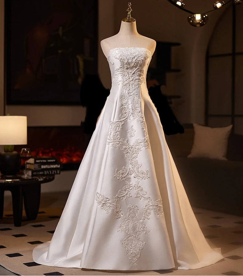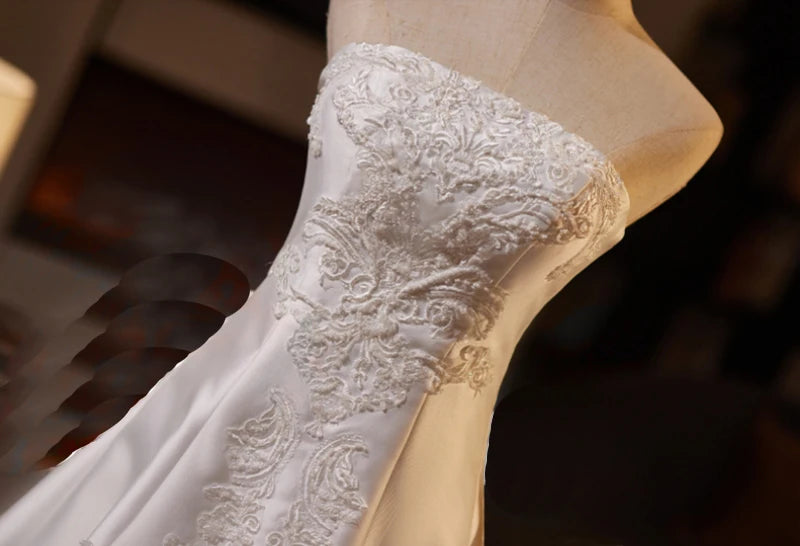 Elevate your wedding day with this exquisite strapless bridal gown, crafted from luxurious satin and adorned with delicate lace detailing. The sweetheart neckline and structured bodice create a flattering silhouette, while the flowing skirt offers graceful movement as you walk down the aisle. Premium satin fabric drapes beautifully, providing both comfort and sophistication throughout your celebration. The intricate lace embellishments add timeless elegance and romantic charm. Perfect for the modern bride seeking a classic yet refined aesthetic, this gown combines impeccable tailoring with stunning design elements that will make your special day truly unforgettable.
