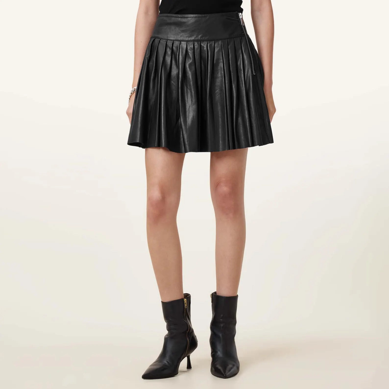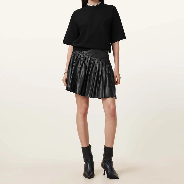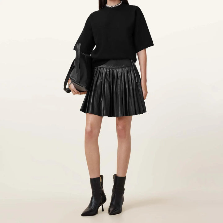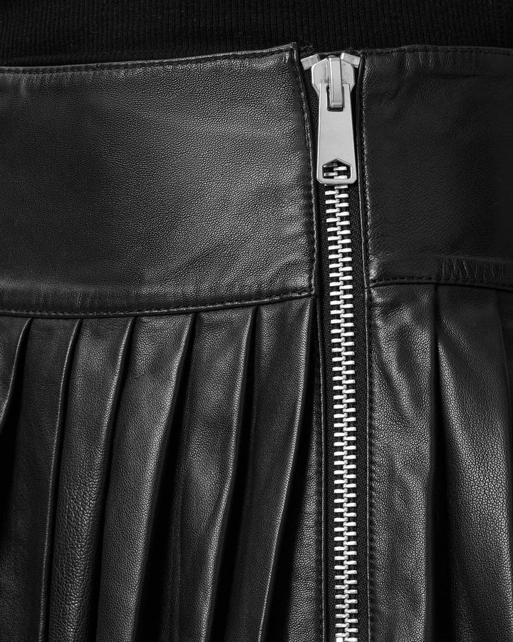 Crafted from premium soft leather, this mini skirt features an elastic waistband and flattering A-line pleats. Its ultra-soft material and comfortable fit make it the perfect addition to any wardrobe. Elevate your style with this versatile and chic piece.