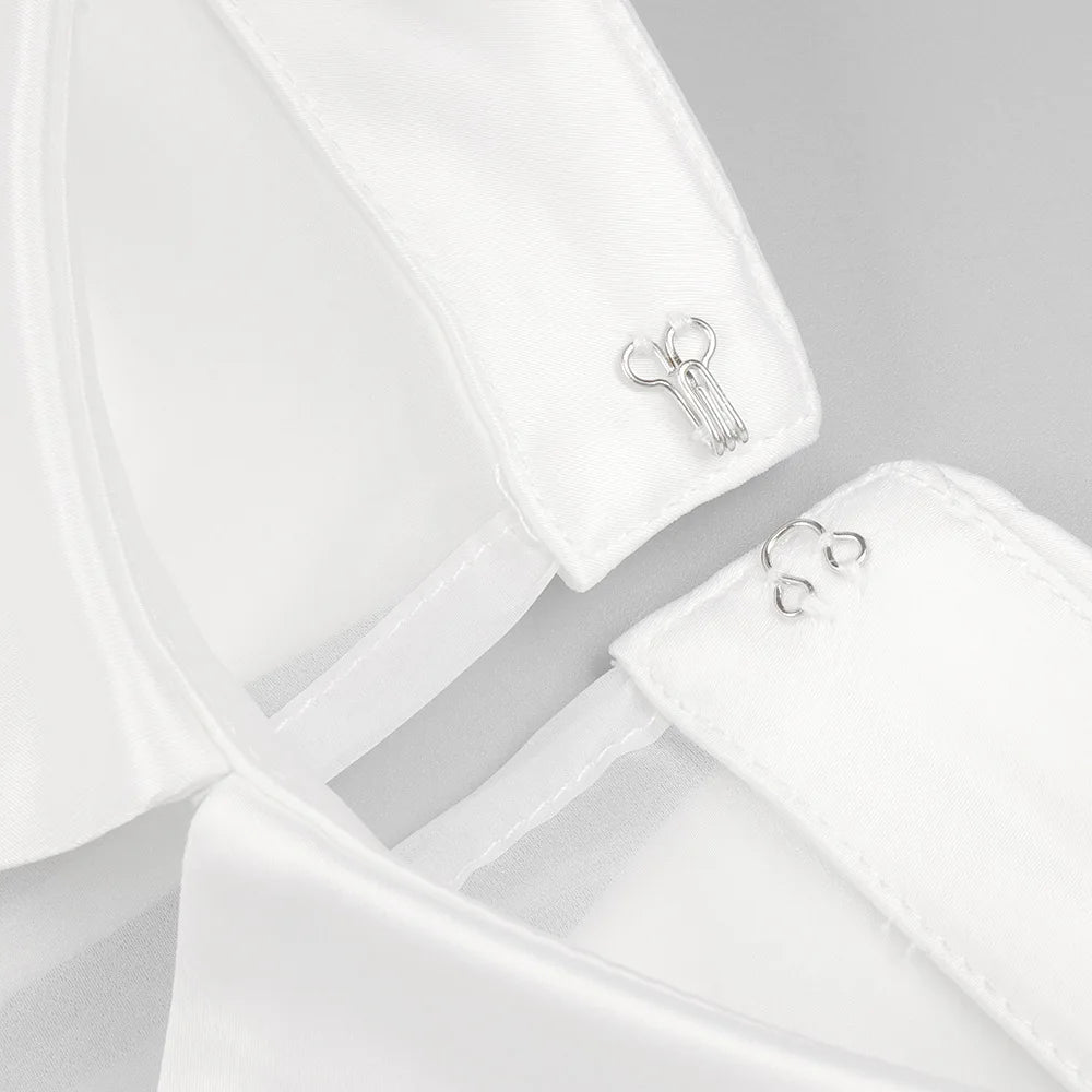 A woman wearing a white sleeveless mini dress with a square neckline, adorned with pearl and diamond beading, designed for evening or party wear.