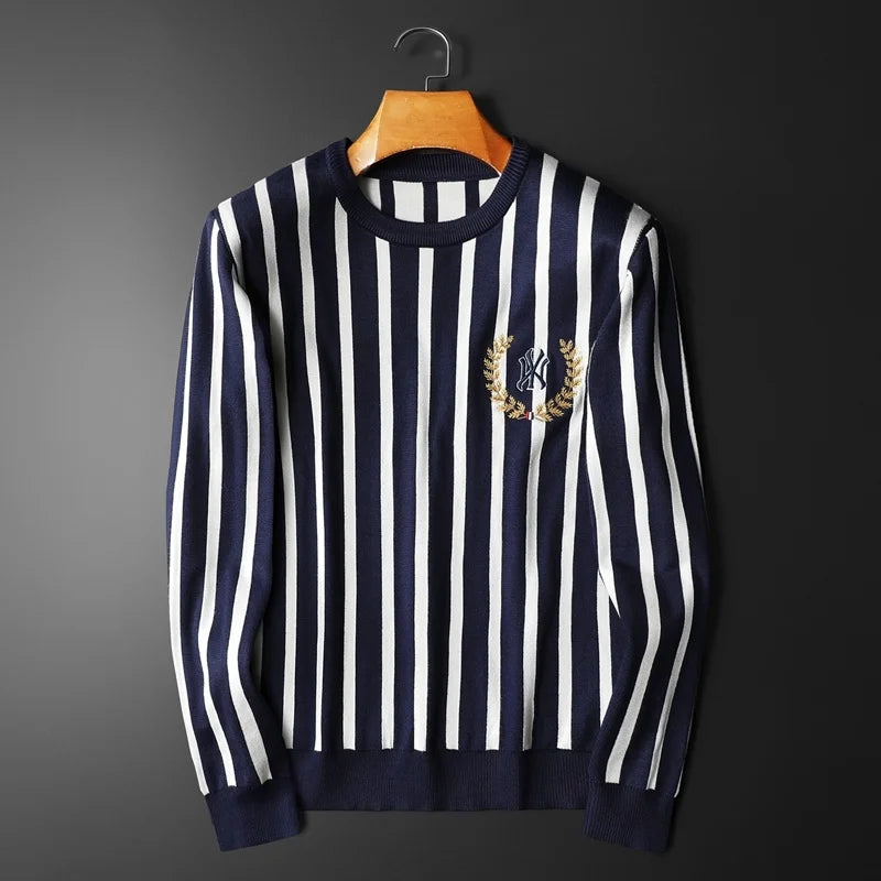Upgrade your wardrobe with our Elegant Stripe Contrast Men’s Slim Sweater. This sleek and stylish sweater features a modern striped design that will elevate any outfit. Made with high-quality materials, it provides both comfort and style. Stay warm and fashionable in this must-have piece.