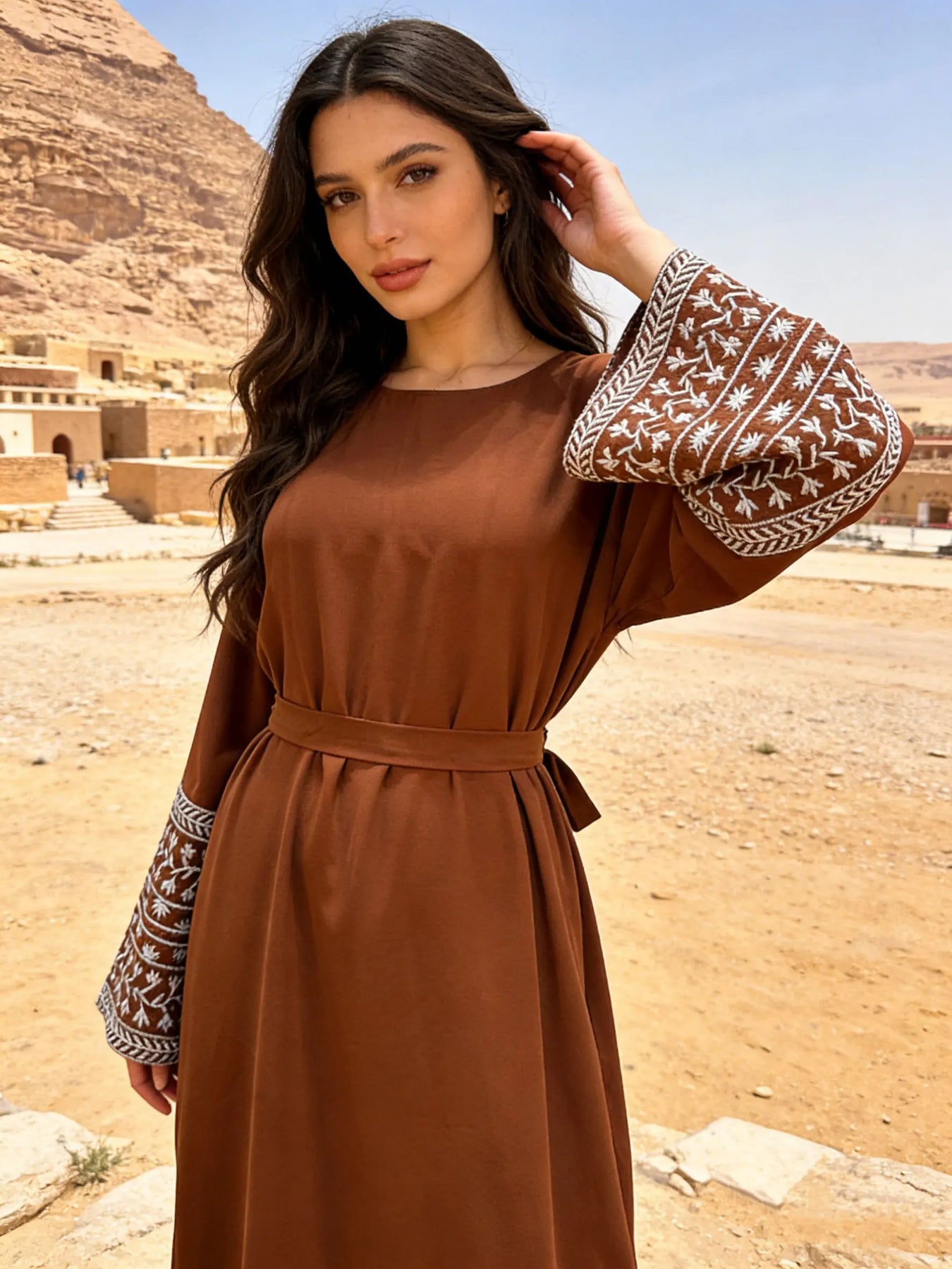 Elevate your modest wardrobe with this beautifully crafted belted abaya dress, designed for contemporary elegance. Featuring intricate embroidery detailing that adds sophistication to the flowing silhouette, this piece combines traditional styling with modern sensibility. The integrated belt defines the waistline, creating a flattering shape whilst maintaining full coverage. Crafted from quality fabric that drapes gracefully, it's versatile enough for daily wear or special occasions. A timeless investment piece that reflects refined taste and cultural appreciation.