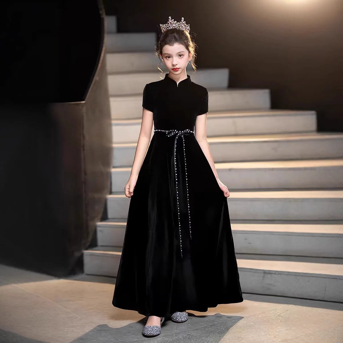 Crafted from soft, luxurious velvet, this Charming Velvet Girl's Princess Dress offers exceptional comfort and elegance for special occasions. Its refined design features delicate details that enhance a young girl's appearance, making her feel like royalty. The dress balances style and wearability, perfect for celebrations or formal events where a charming, classic look is desired.
