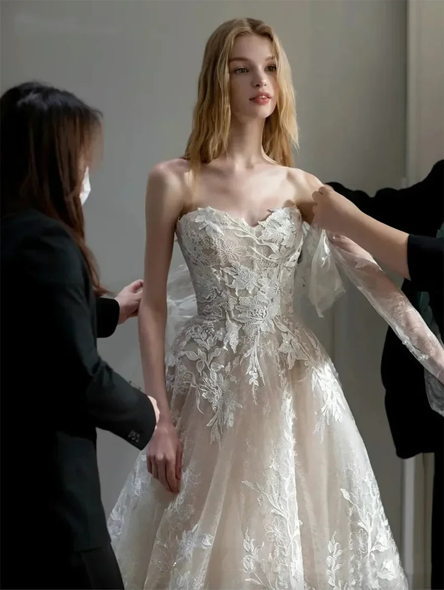 This exquisite A-line wedding gown epitomises timeless elegance and refined sophistication. Crafted with meticulous attention to detail, the silhouette flatters the feminine form whilst providing graceful movement throughout your celebration. The structured bodice offers exceptional support, whilst the flowing skirt creates a dramatic yet balanced aesthetic. Premium fabrics and expert tailoring ensure both comfort and confidence on your special day. A versatile choice that transcends fleeting trends, this gown delivers the polished, luxurious appearance befitting a bride's most cherished moment.
