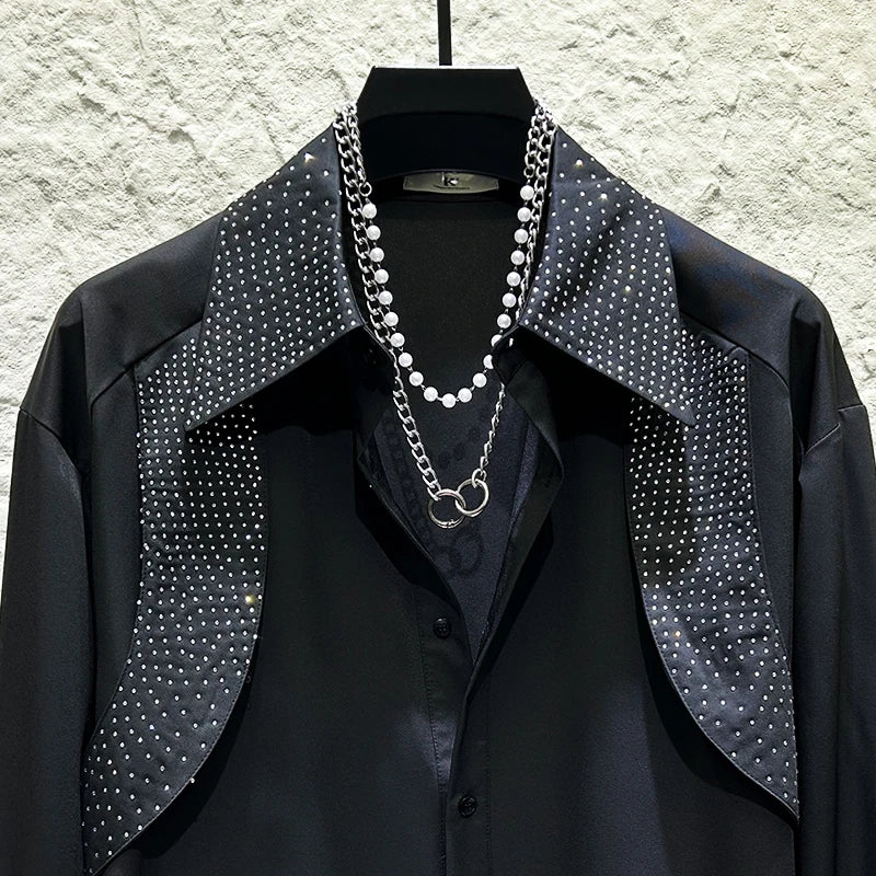 Elevate your formal wardrobe with this sophisticated men's dress shirt, meticulously crafted for the discerning gentleman. Featuring exquisite rhinestone embellishments that catch the light with every movement, this piece seamlessly blends classic tailoring with contemporary glamour. The premium construction ensures a refined silhouette perfect for black-tie events, upscale celebrations, or making a memorable impression at formal occasions. Impeccably detailed and designed to command attention, this shirt transforms ordinary formal wear into an extraordinary statement of style and confidence.