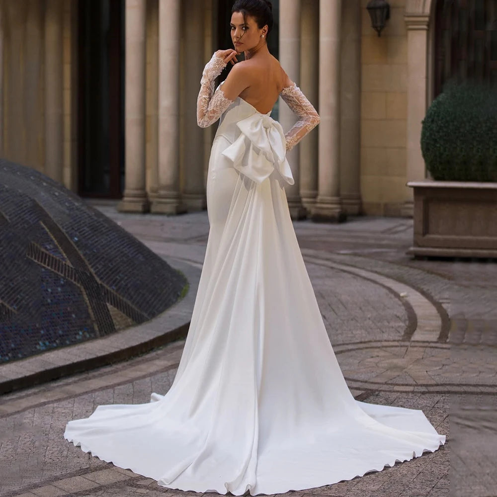 This meticulously crafted backless bridal gown combines luxurious satin fabric with elegant design for a timeless wedding look. The smooth satin drapes gracefully, enhancing silhouette while the open back adds a sophisticated, modern touch. Designed for comfort and style, this gown offers a flawless fit, ensuring you feel confident and radiant on your special day.