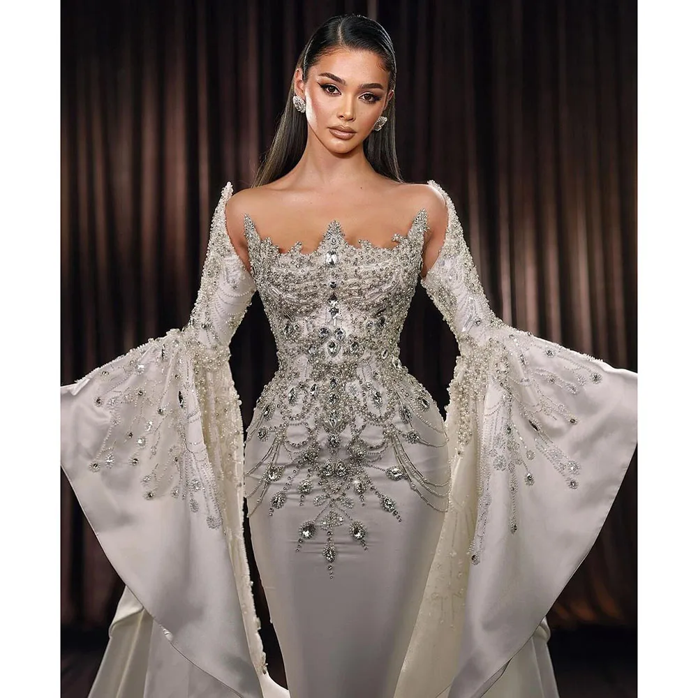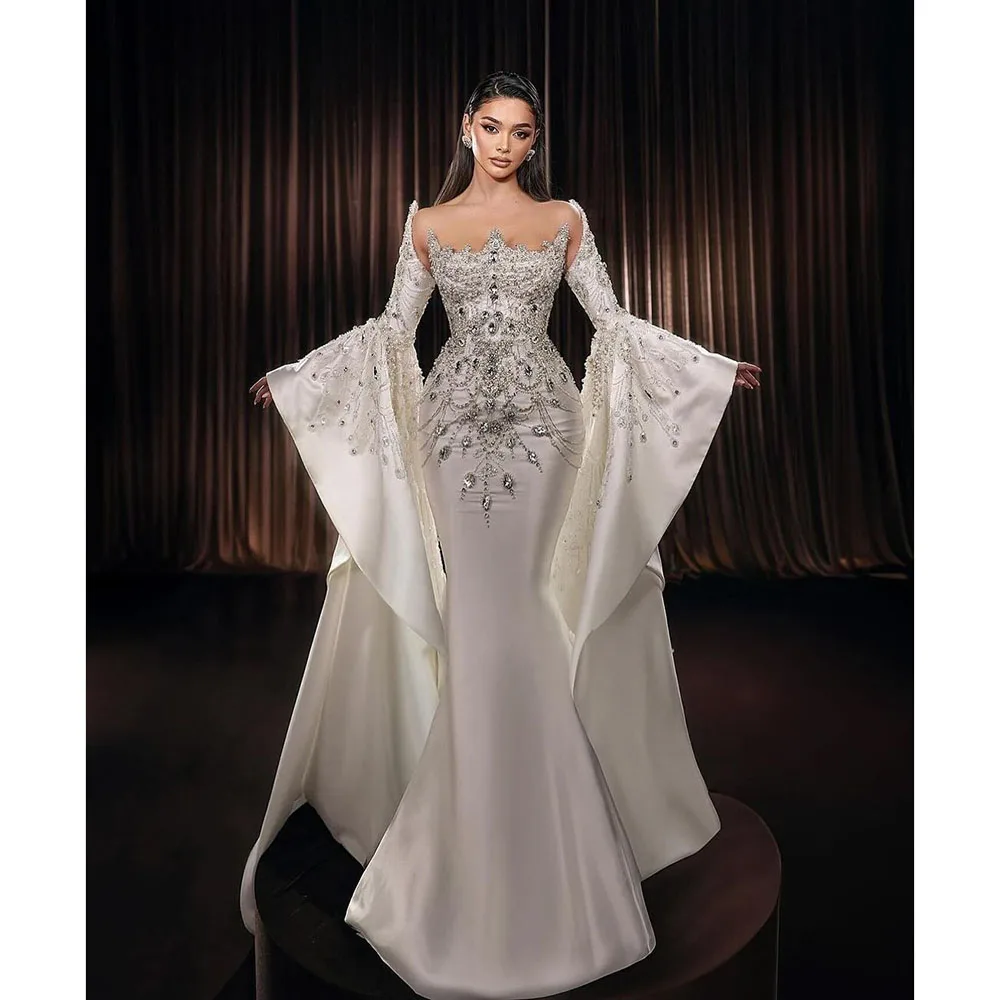 Robe de soirée blanche luxueuse à manches longues et perles de cristal, style sirène, traîne chapelle, robe de bal de luxe, magnifique robe de mariée
