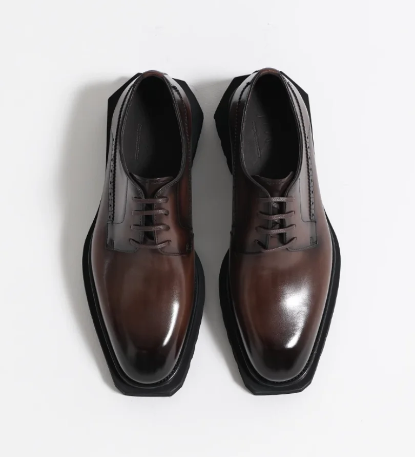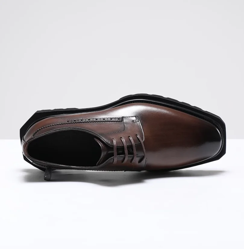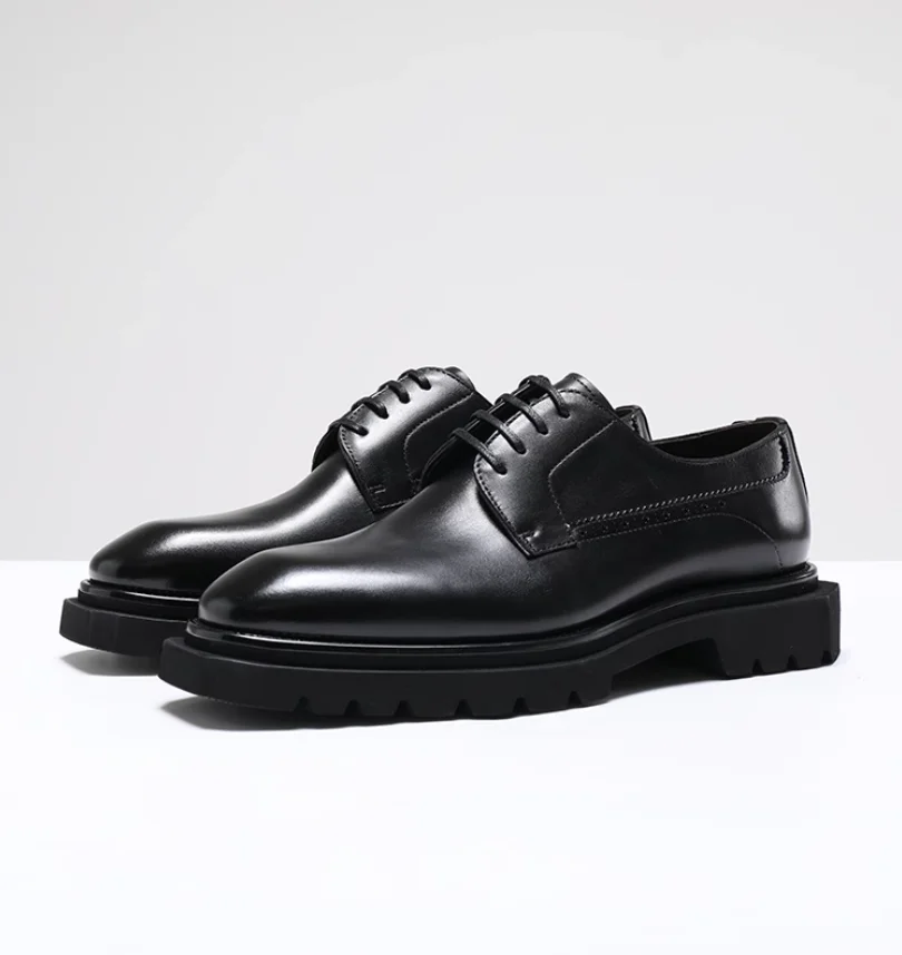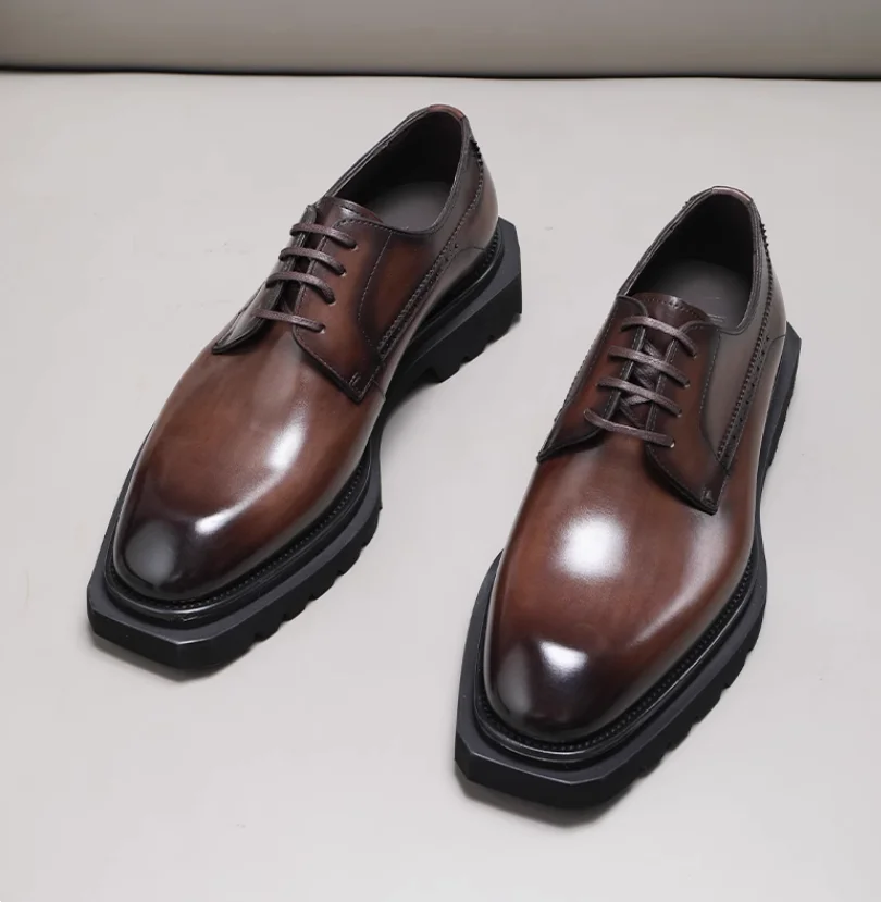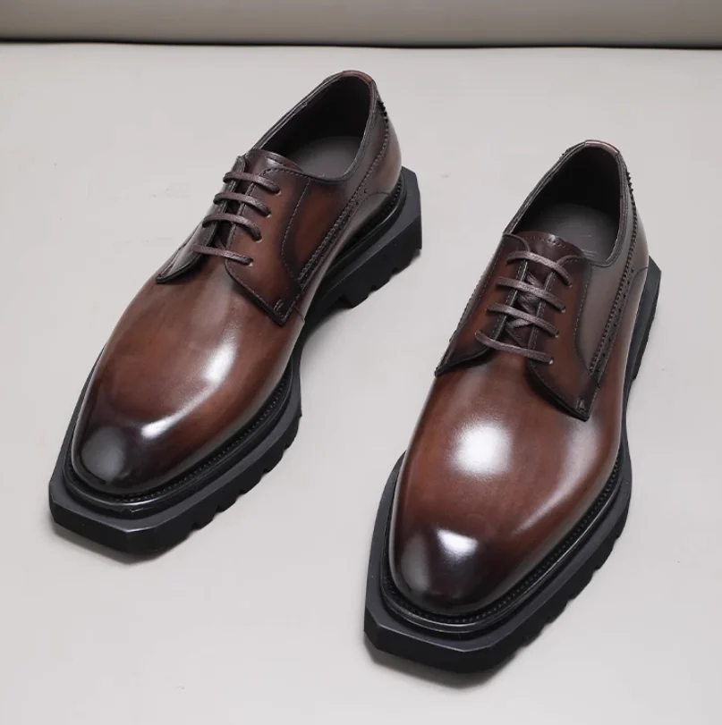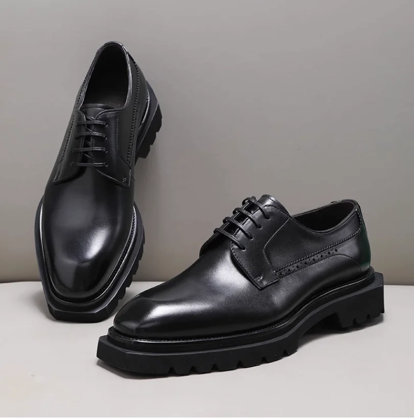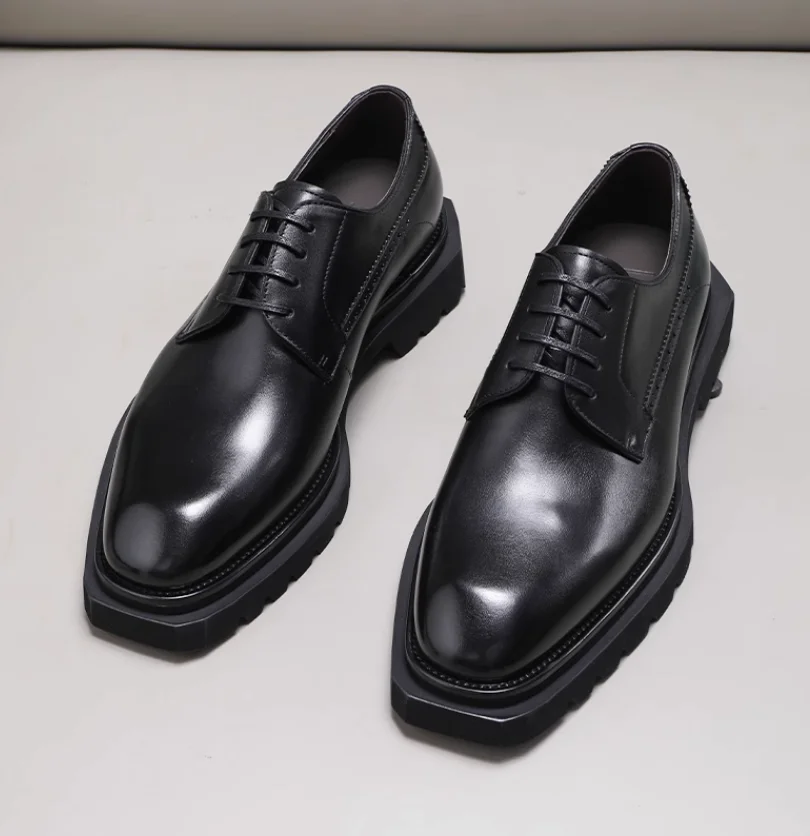 Chaussures en cuir pour hommes à tête carrée haut de gamme faites à la main en cuir véritable noir version coréenne semelle épaisse version européenne De