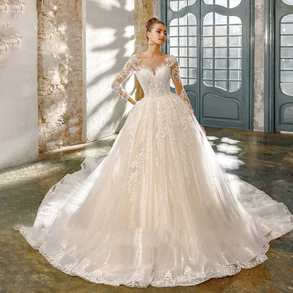 Robe de mariée princesse de luxe personnalisée, coupe trapèze, col rond, manches longues, dentelle, tulle, dos nu, longueur au sol, robe de bal