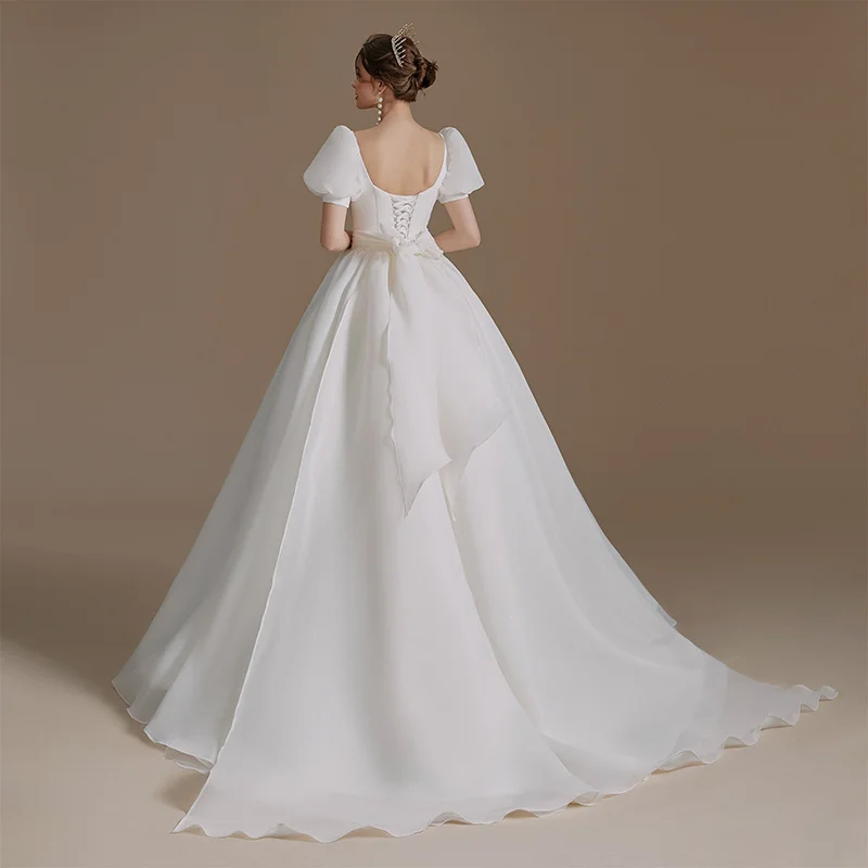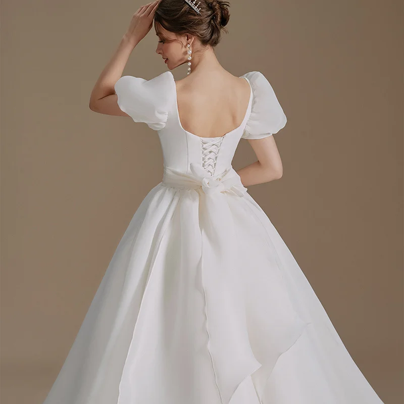 QD06101 Robe de soirée de mariage à manches bouffantes et ceintures, robe de campagne à manches courtes, robe de mariée bohème avec nœud