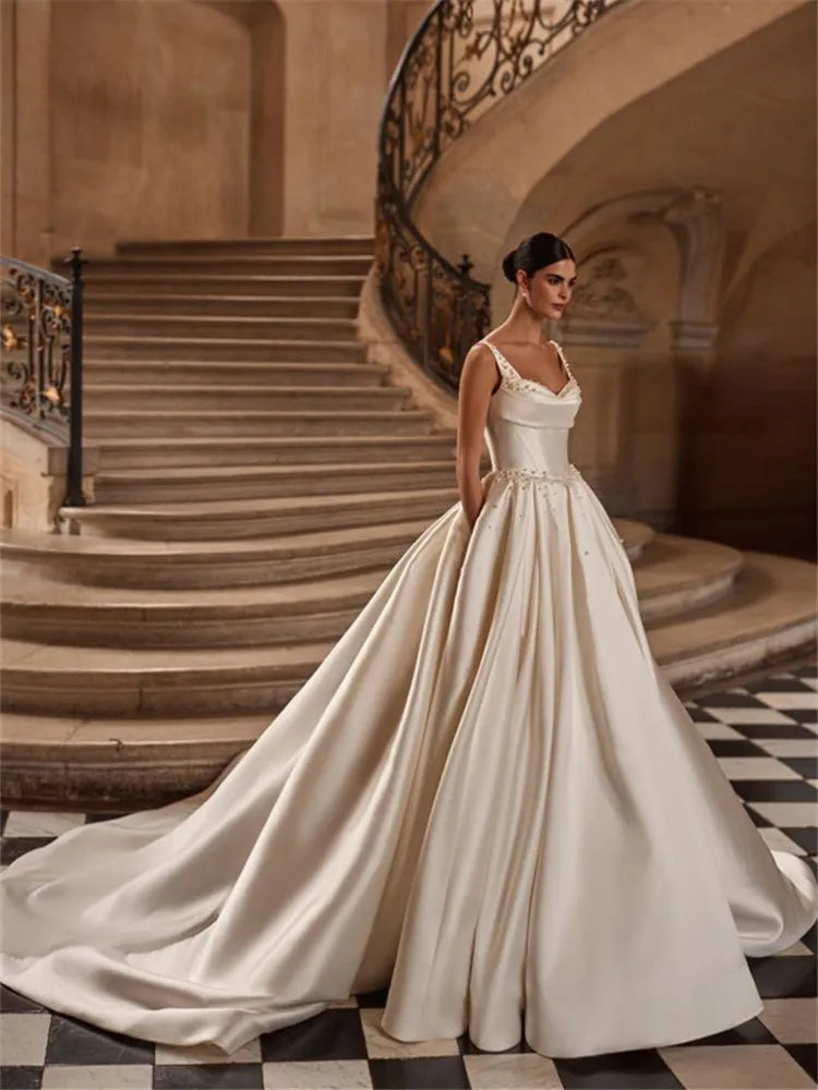Confectionnée en satin luxueux, cette robe de mariée respire l'élégance et la sophistication. Son design raffiné convient à toutes les mariées, avec une silhouette flatteuse et un tissu de qualité qui vous mettra en confiance et vous sublimera lors de votre grand jour. Affirmez votre style avec cette robe sublime.
