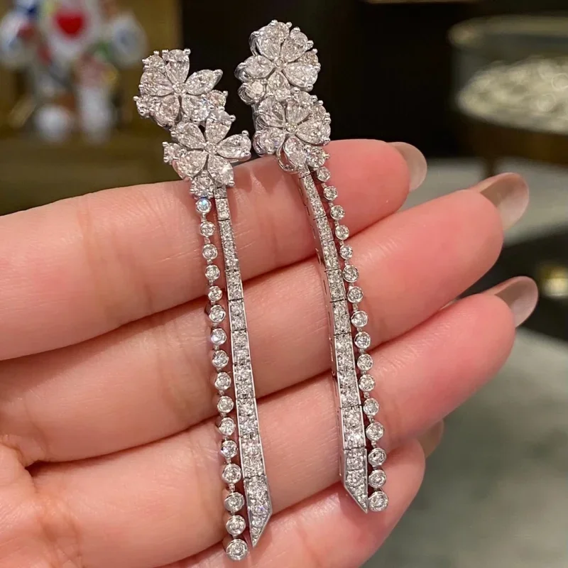 BELLUX Fashion White Cherry Blossom Long Collier Boucles d'oreilles Bracelet Pompon Fleur Parure de Bijoux S925 Argent Zircon Synthétique