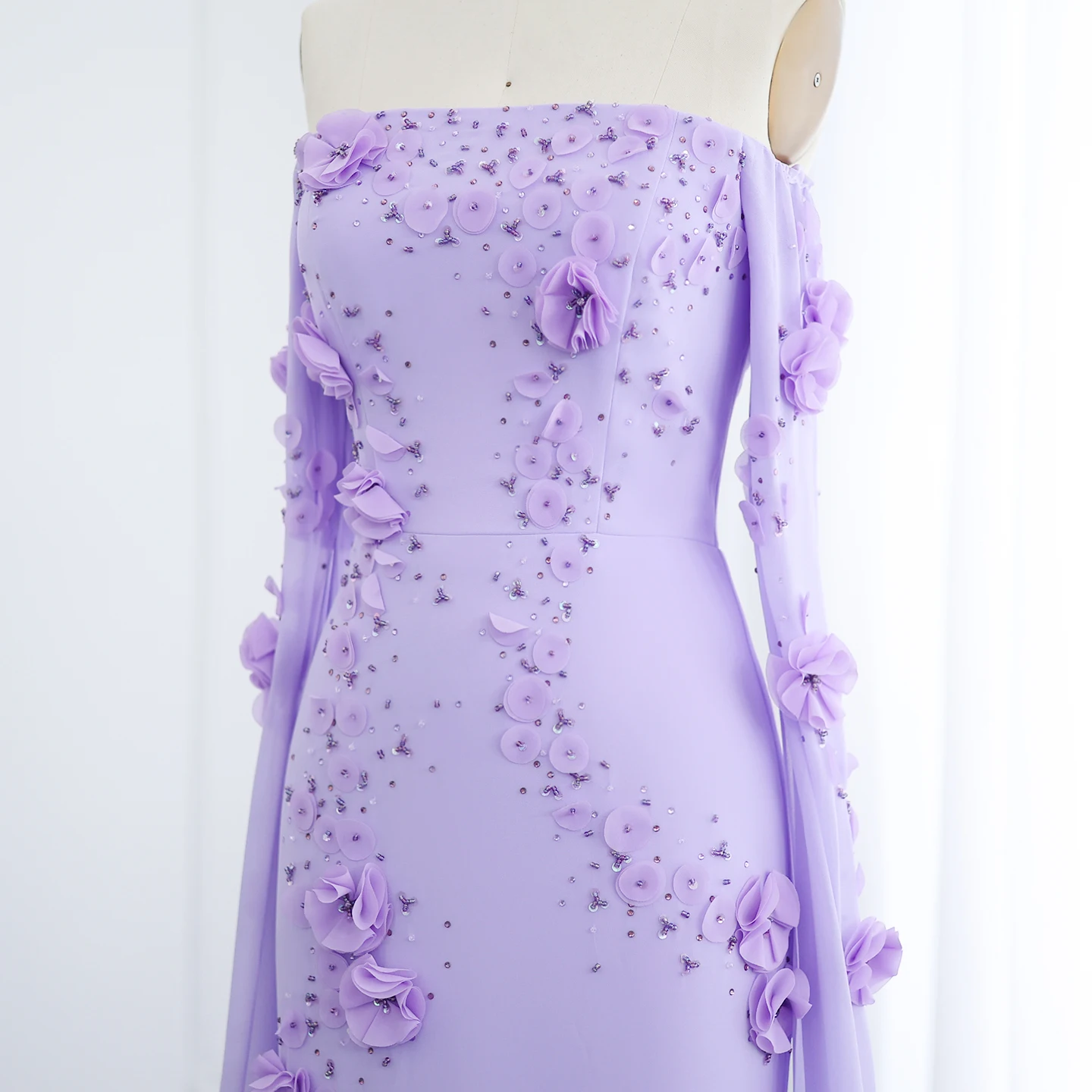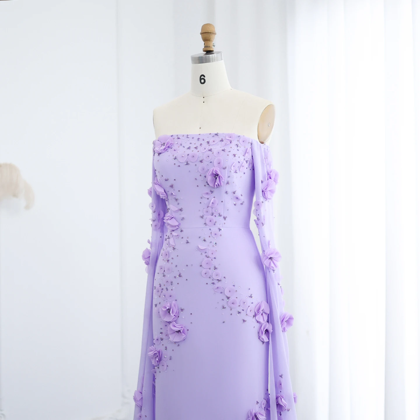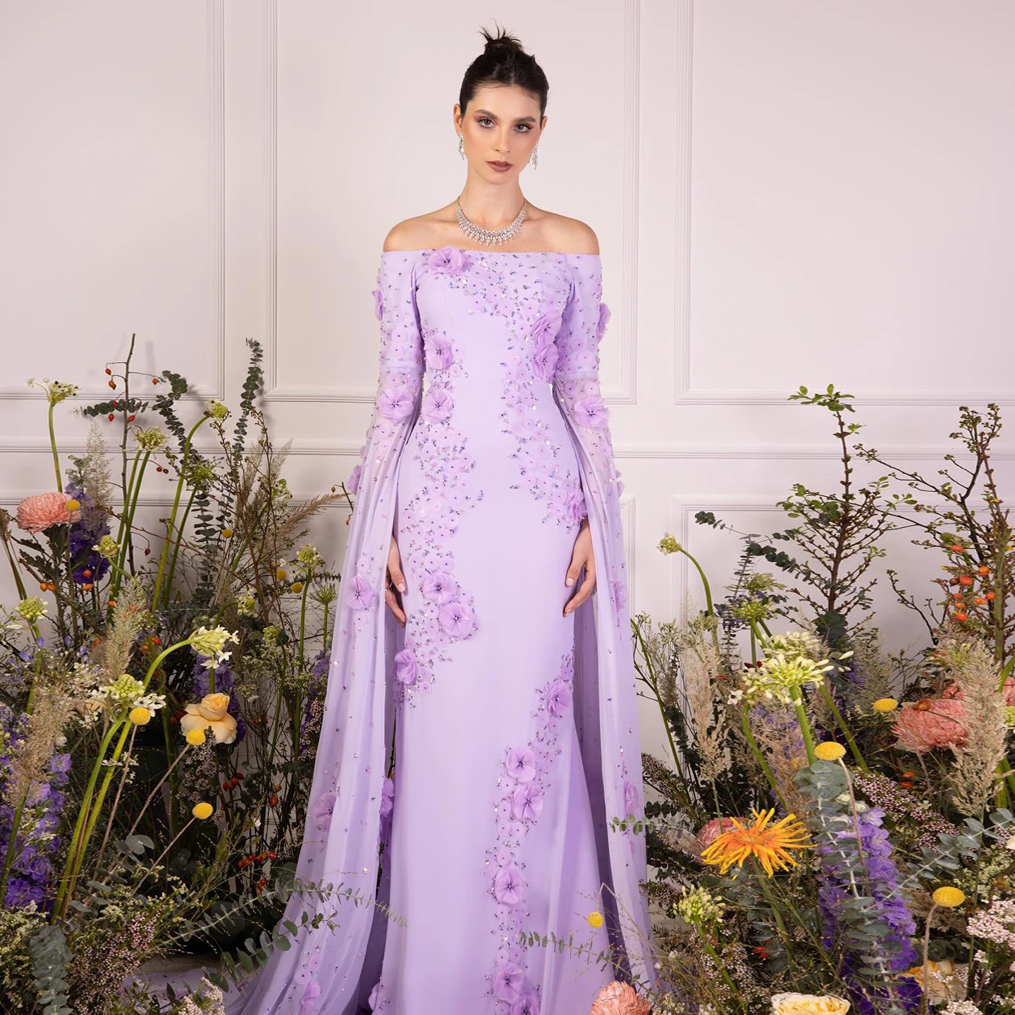 Sharon Said Élégante robe de soirée à épaules dénudées lilas à fleurs 3D Dubaï avec manches cape pour fête de mariage SS450 Personnalisée