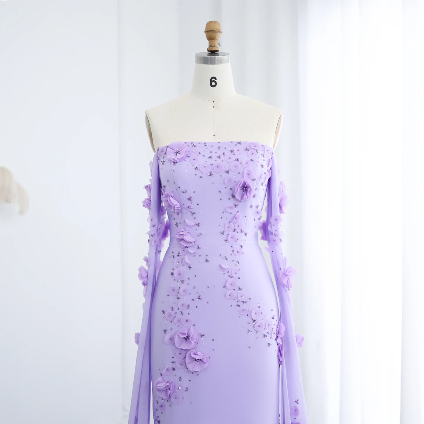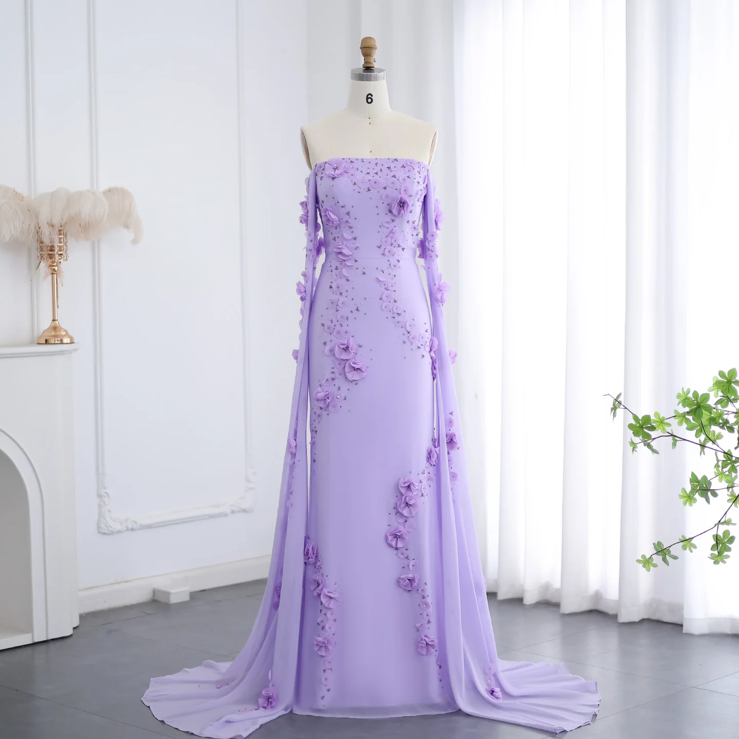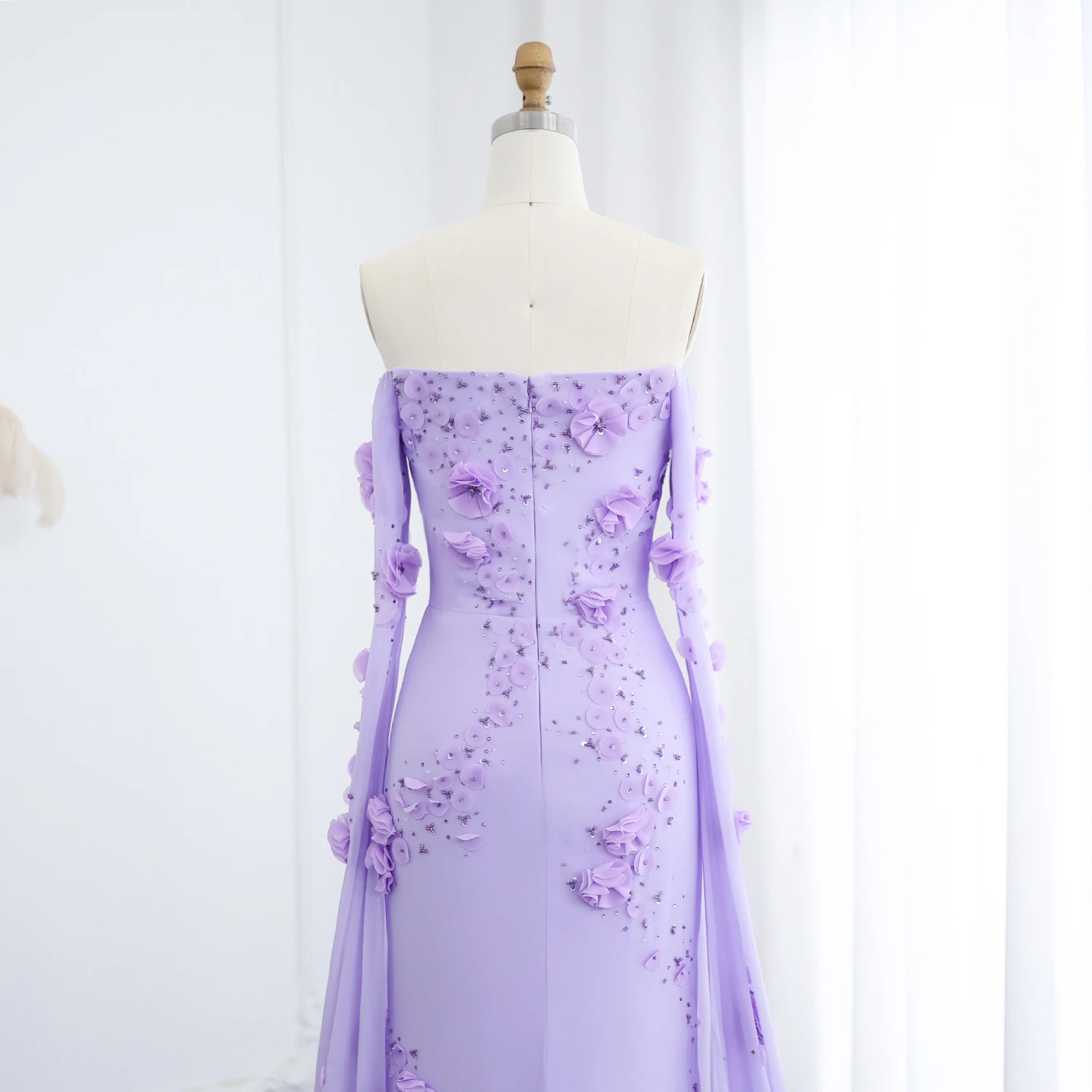 Sharon Said Élégante robe de soirée à épaules dénudées lilas à fleurs 3D Dubaï avec manches cape pour fête de mariage SS450 Personnalisée