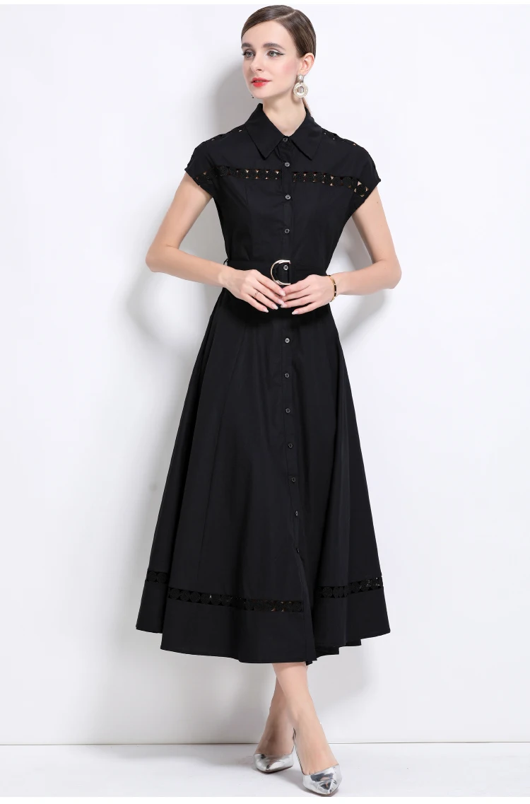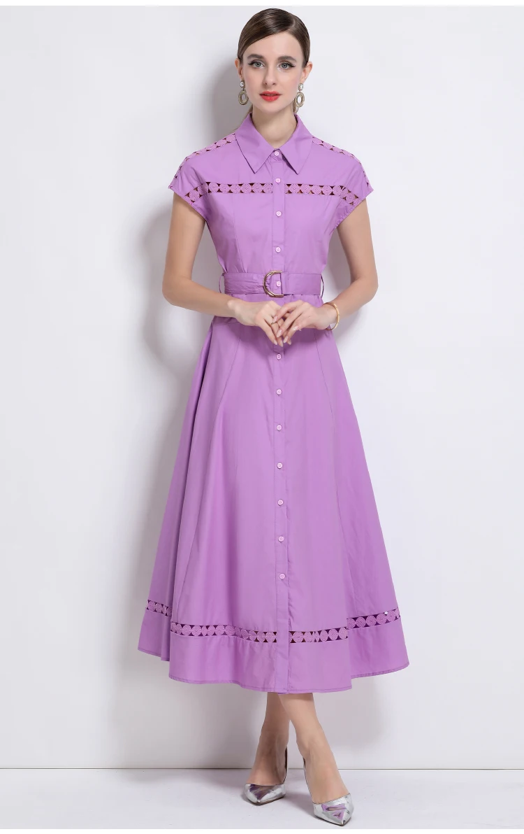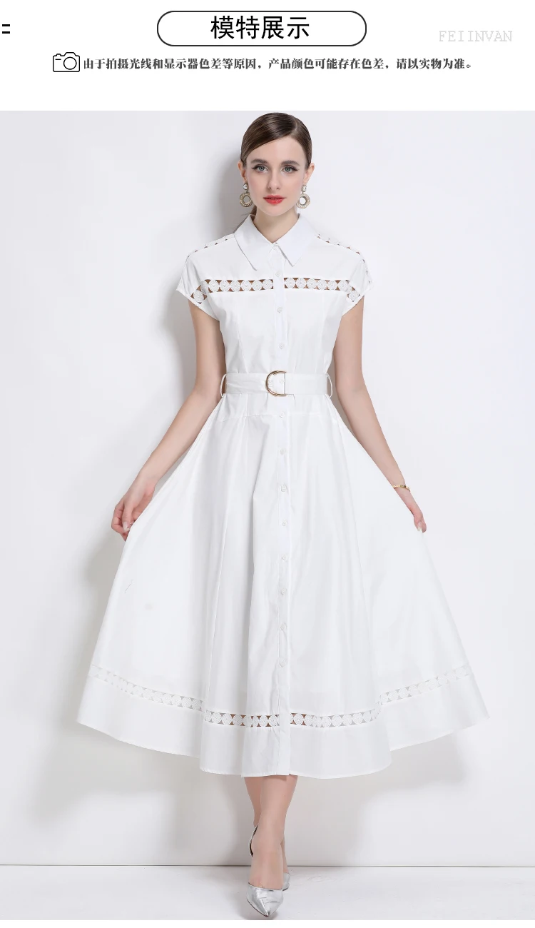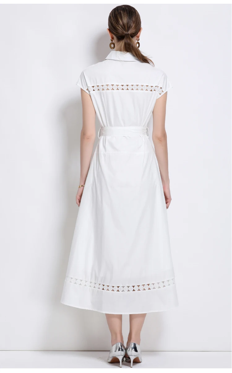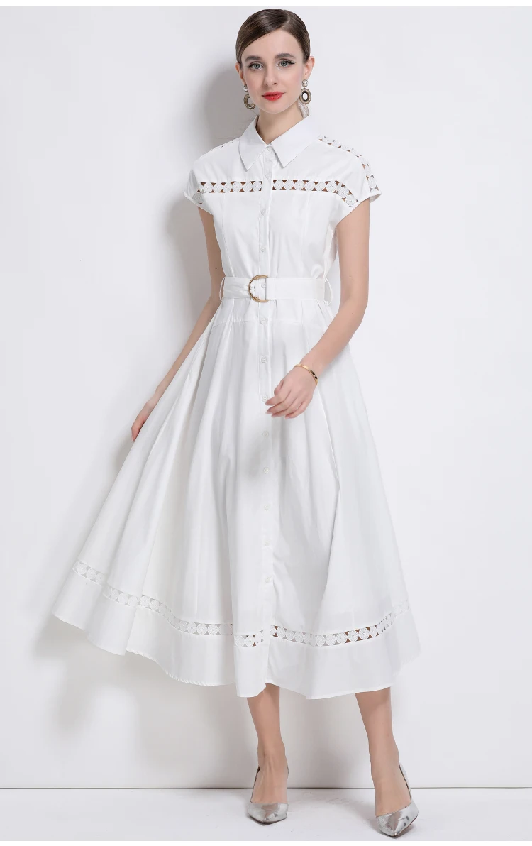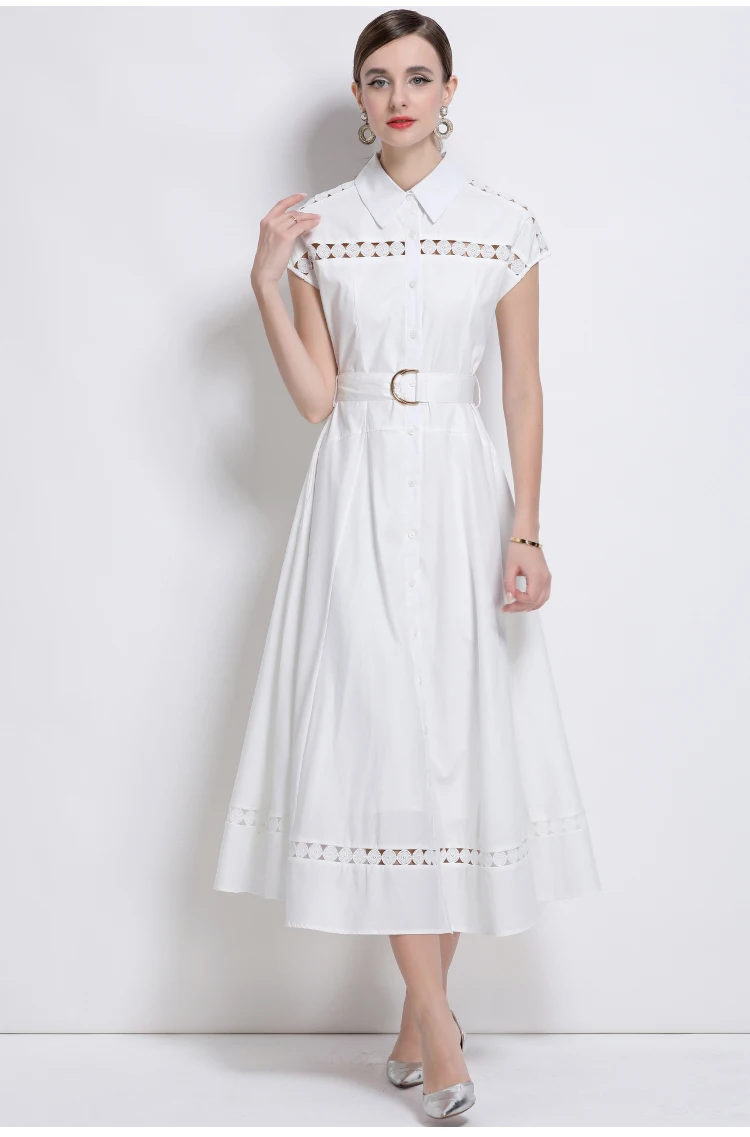 Robe longue en coton à manches courtes et col en V pour femme, tenue élégante et décontractée, avec ceinture ajourée
