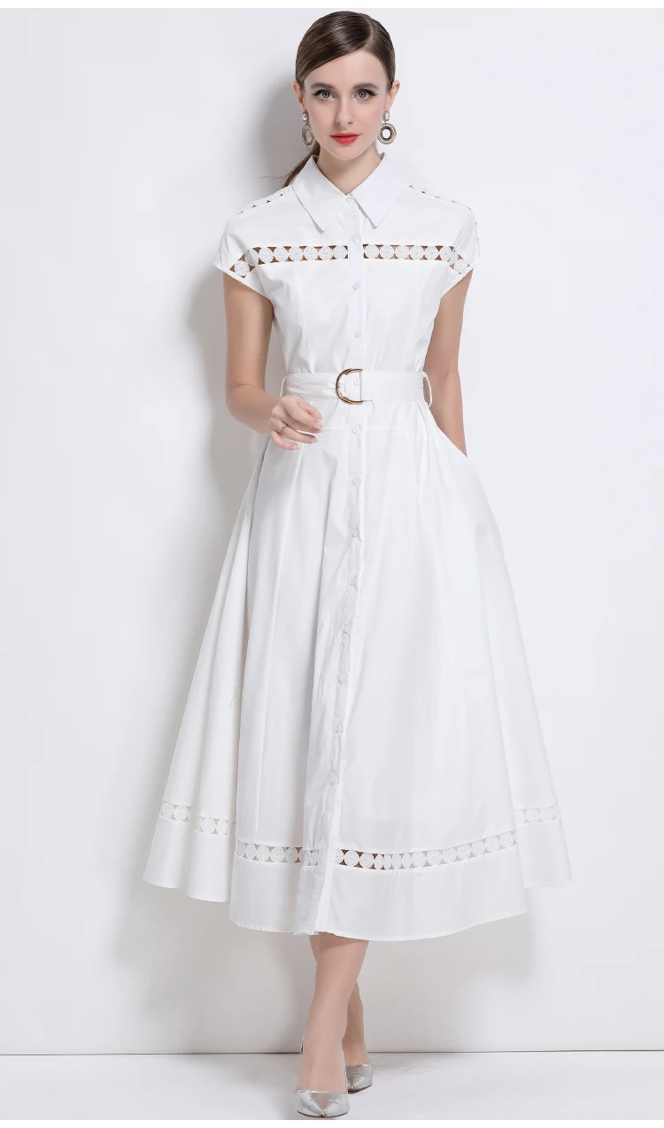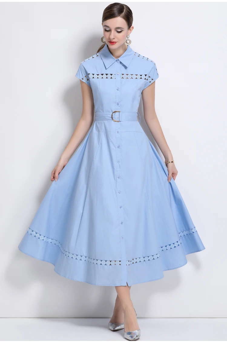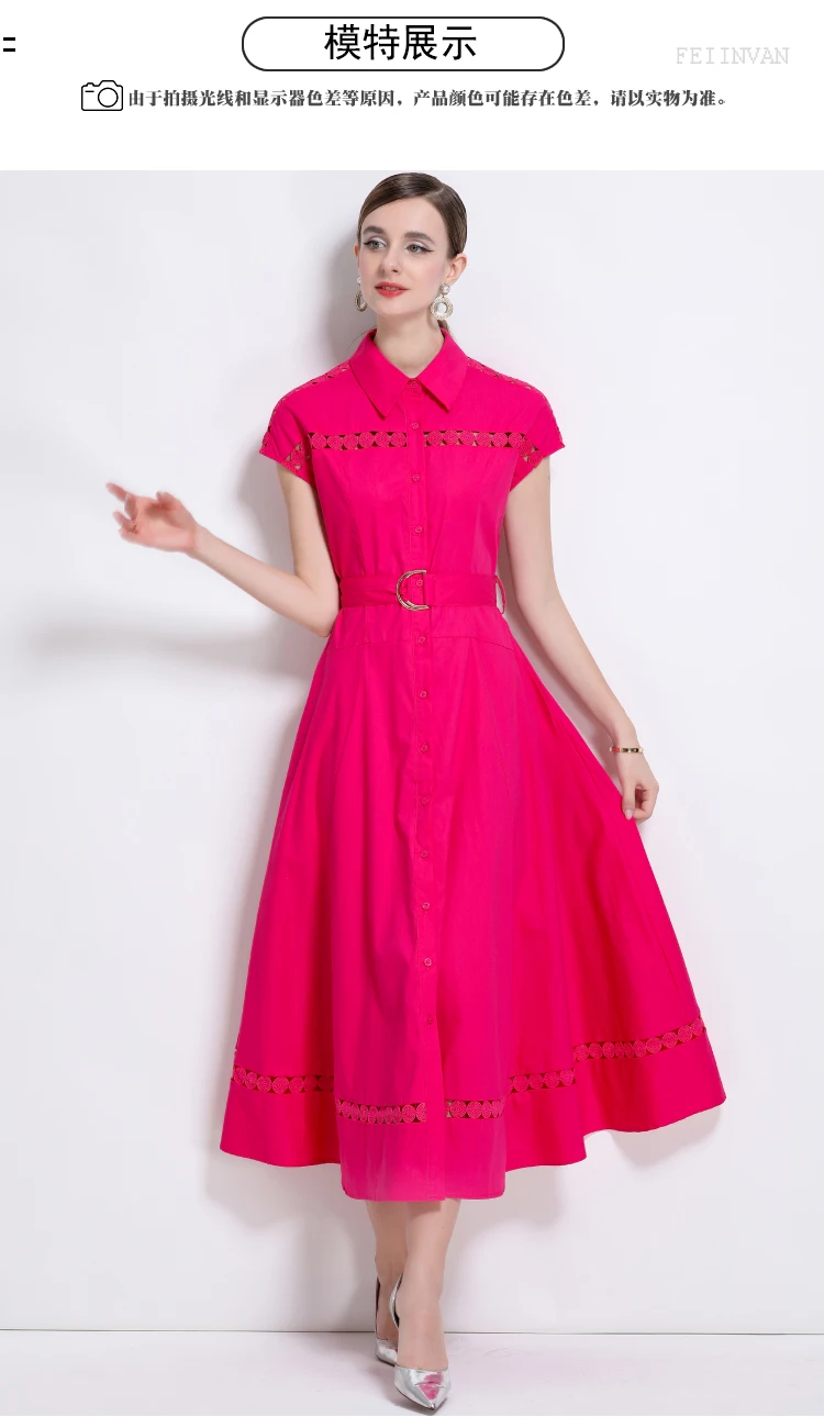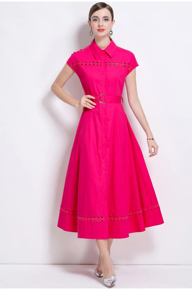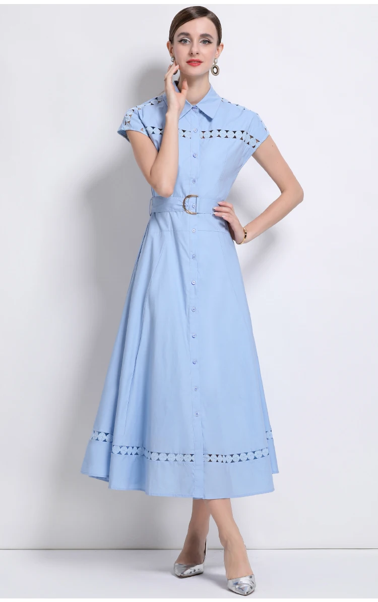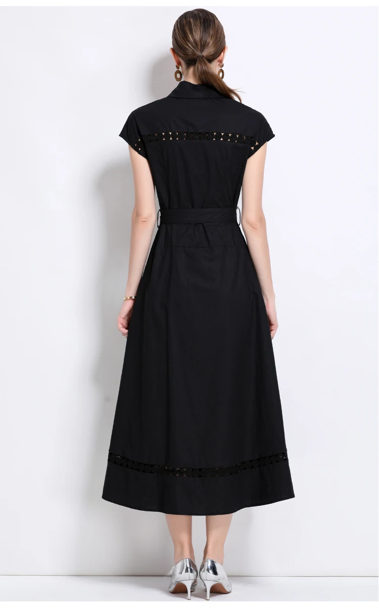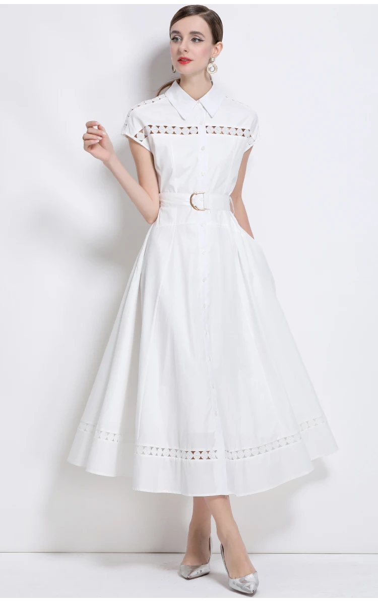 Robe longue en coton à manches courtes et col en V pour femme, tenue élégante et décontractée, avec ceinture ajourée