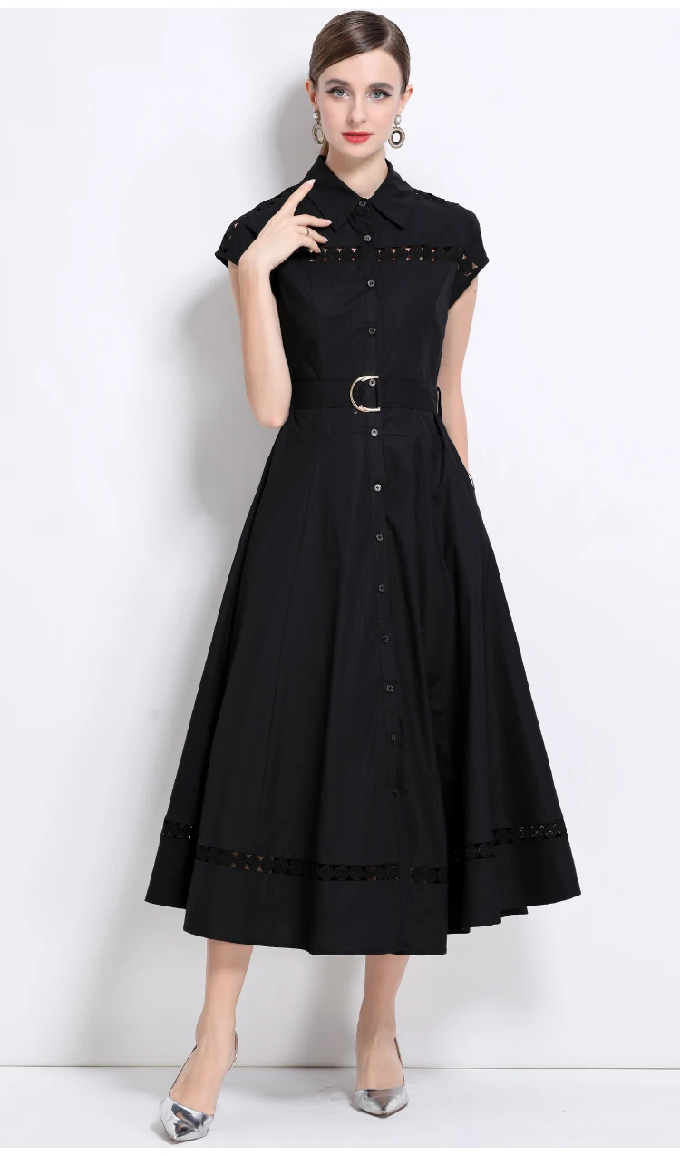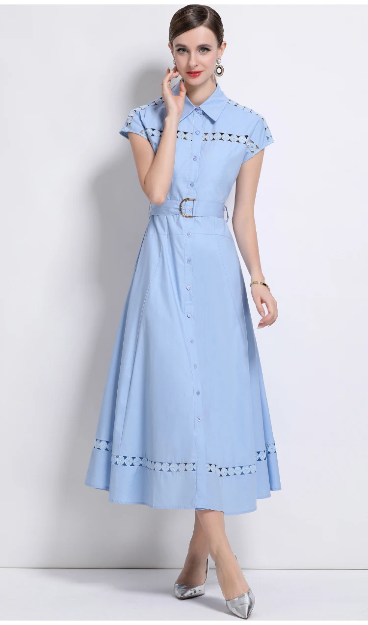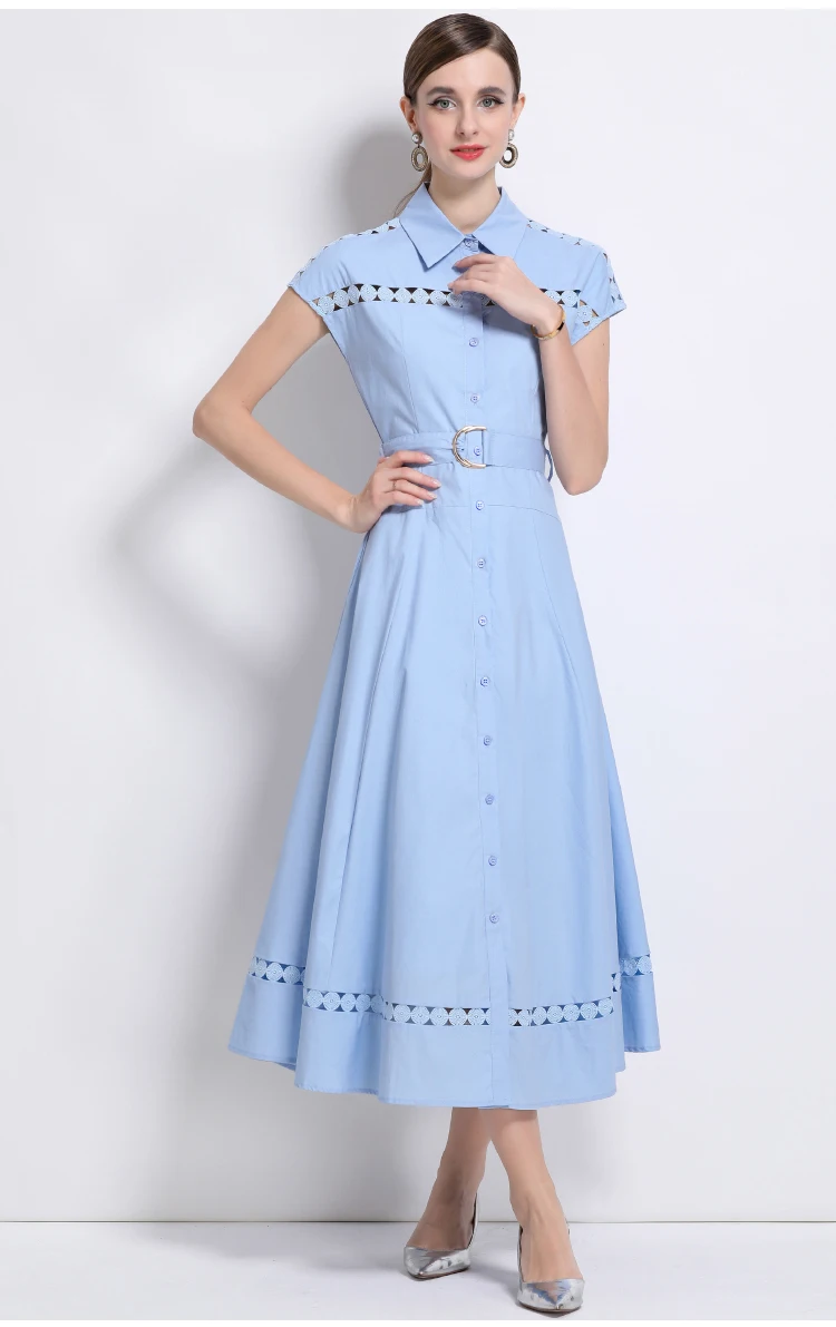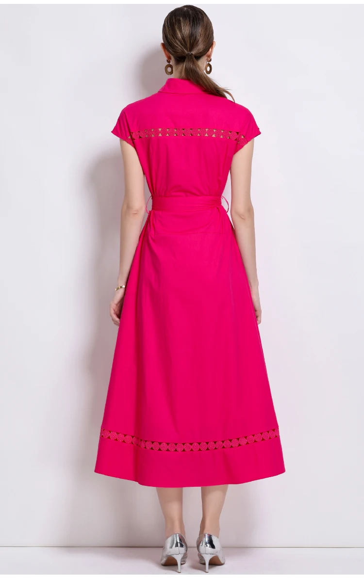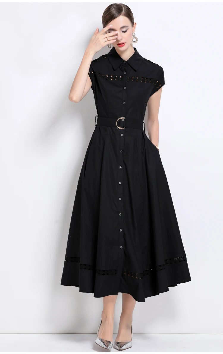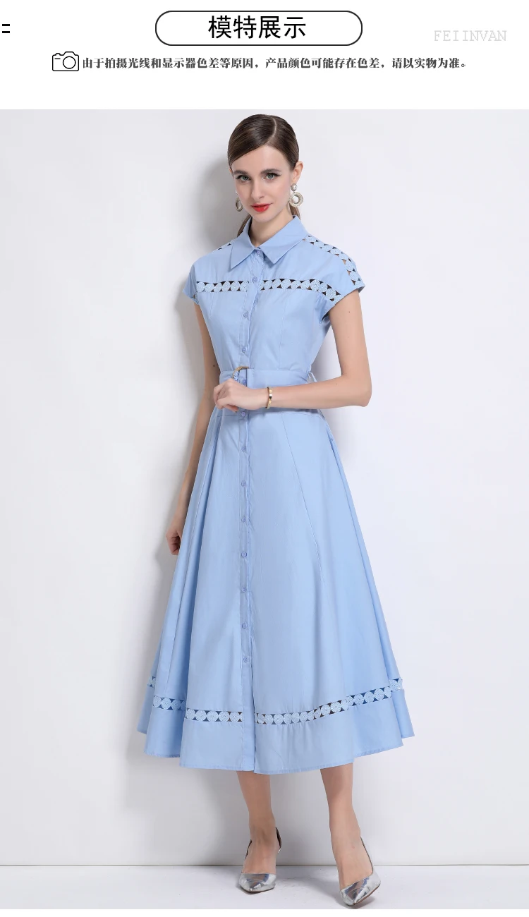 Robe longue en coton à manches courtes et col en V pour femme, tenue élégante et décontractée, avec ceinture ajourée