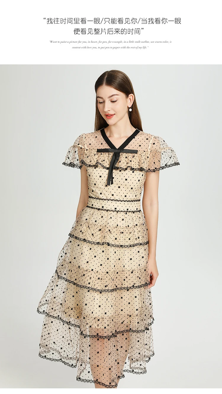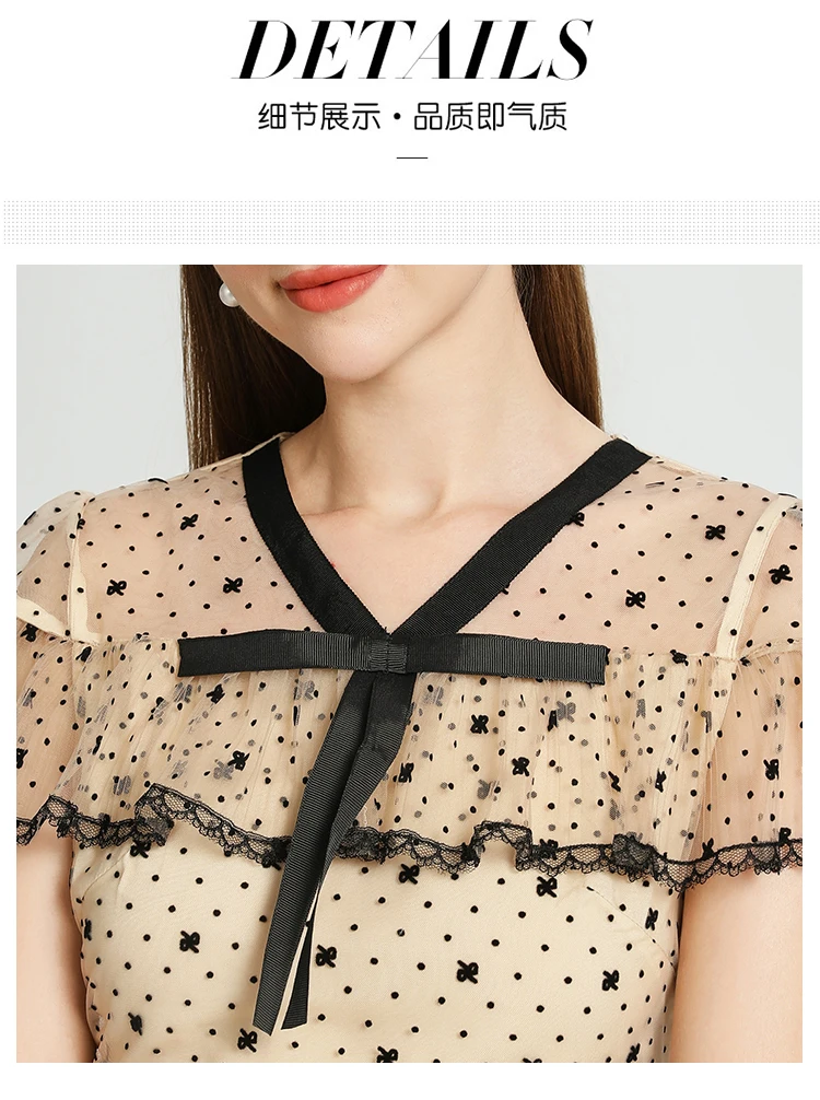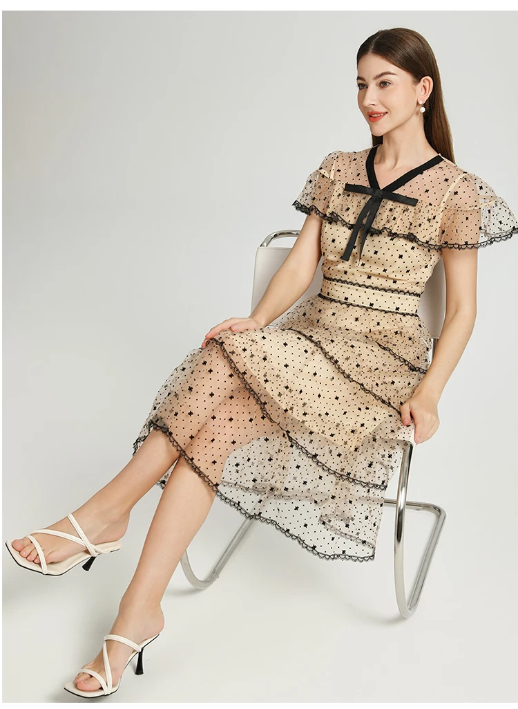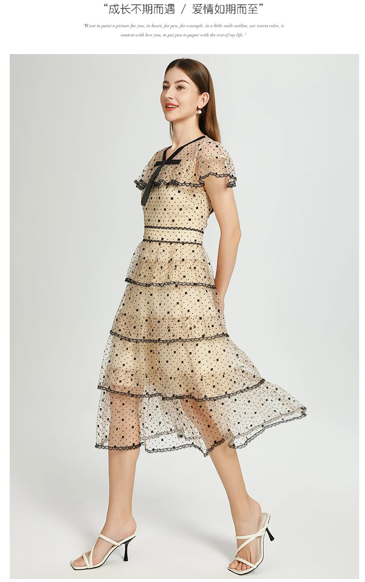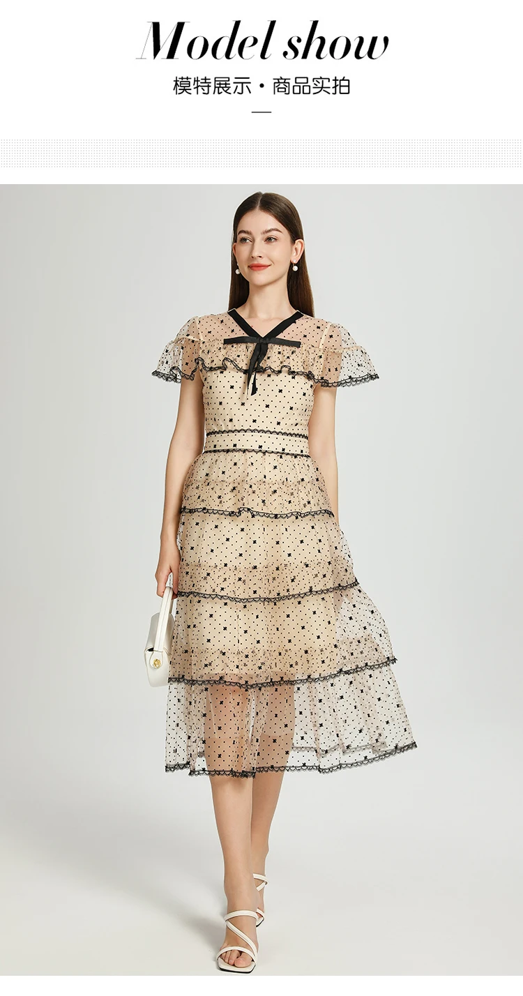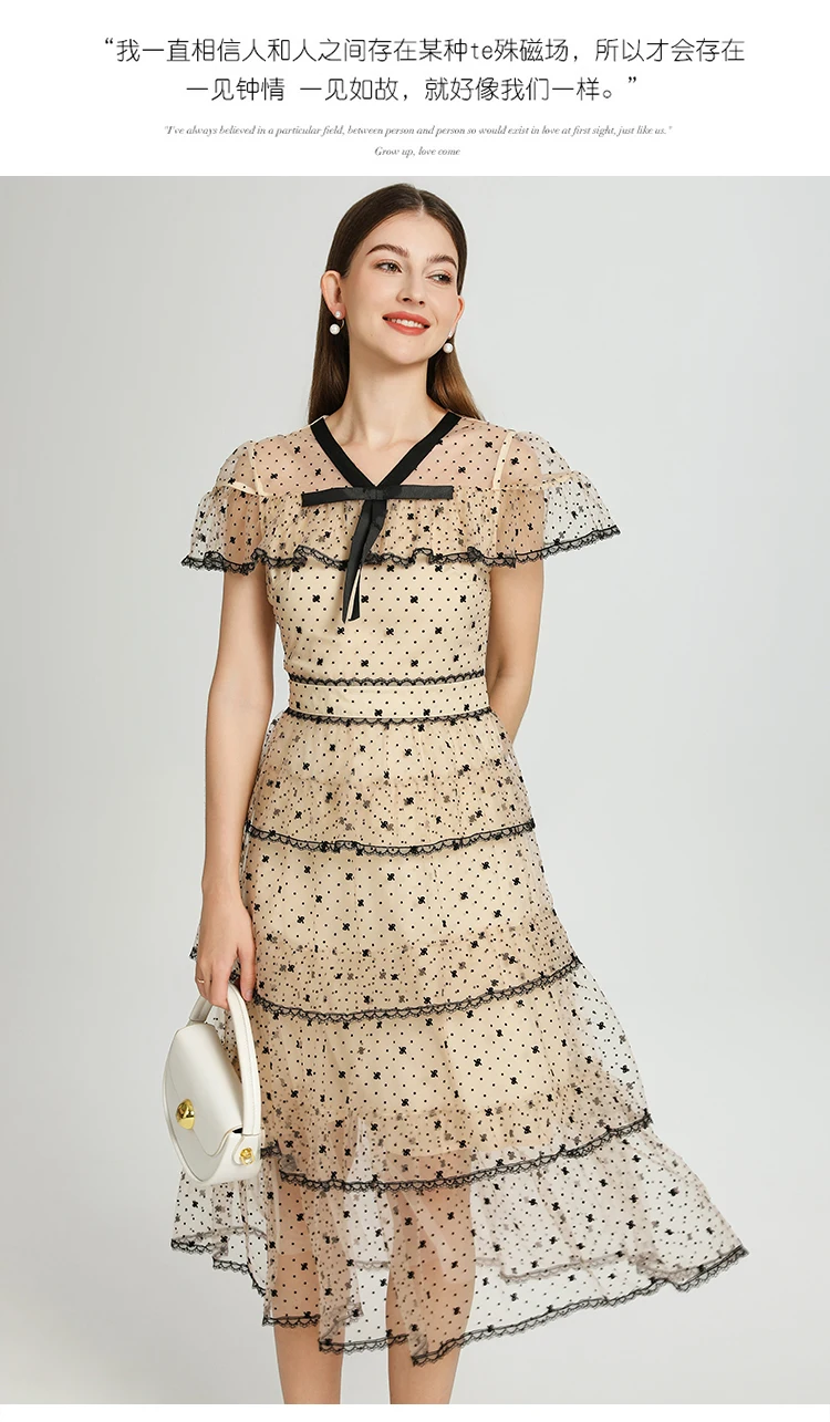 Robe vintage à pois en maille floquée pour femme, tenue d'été décontractée avec nœud papillon, col en V, manches cape et dentelle épissée