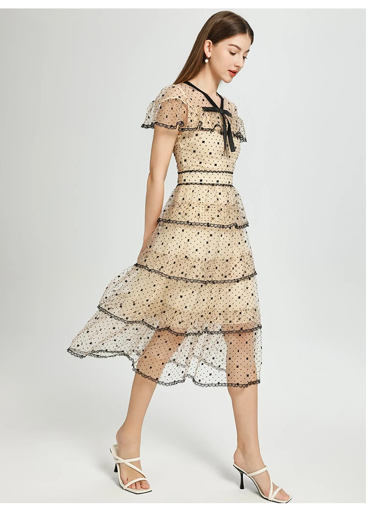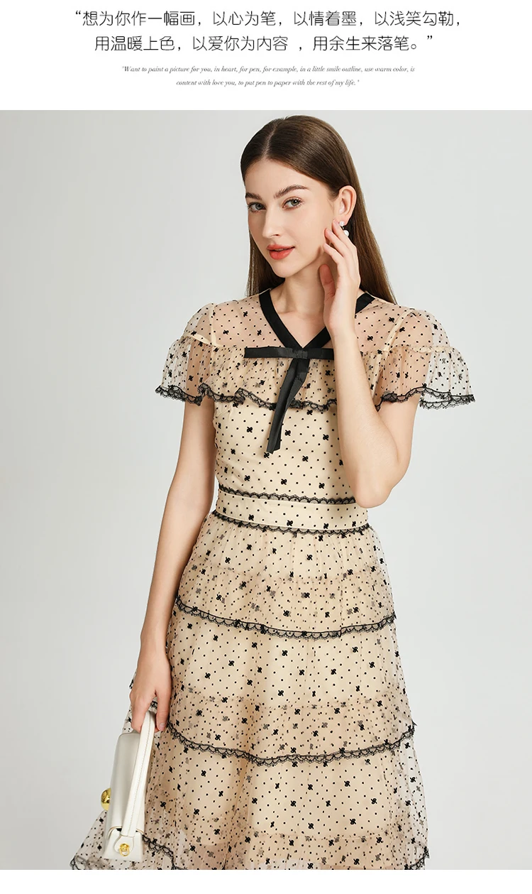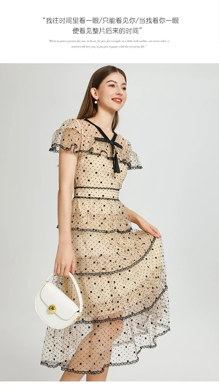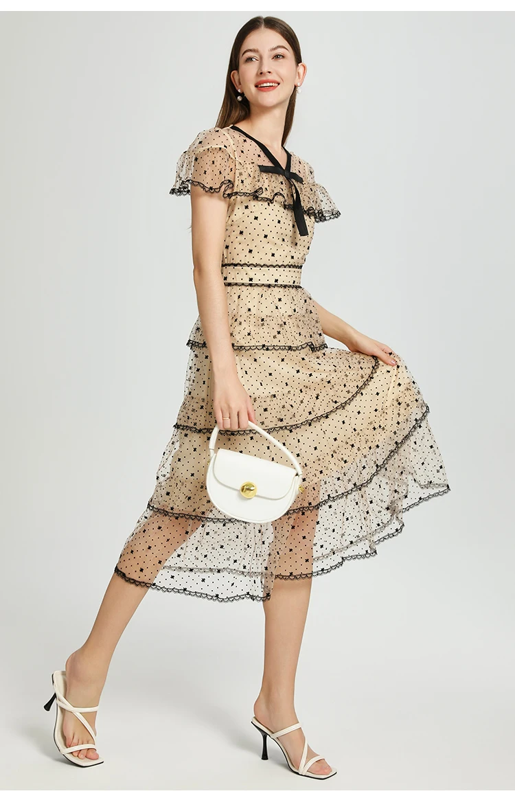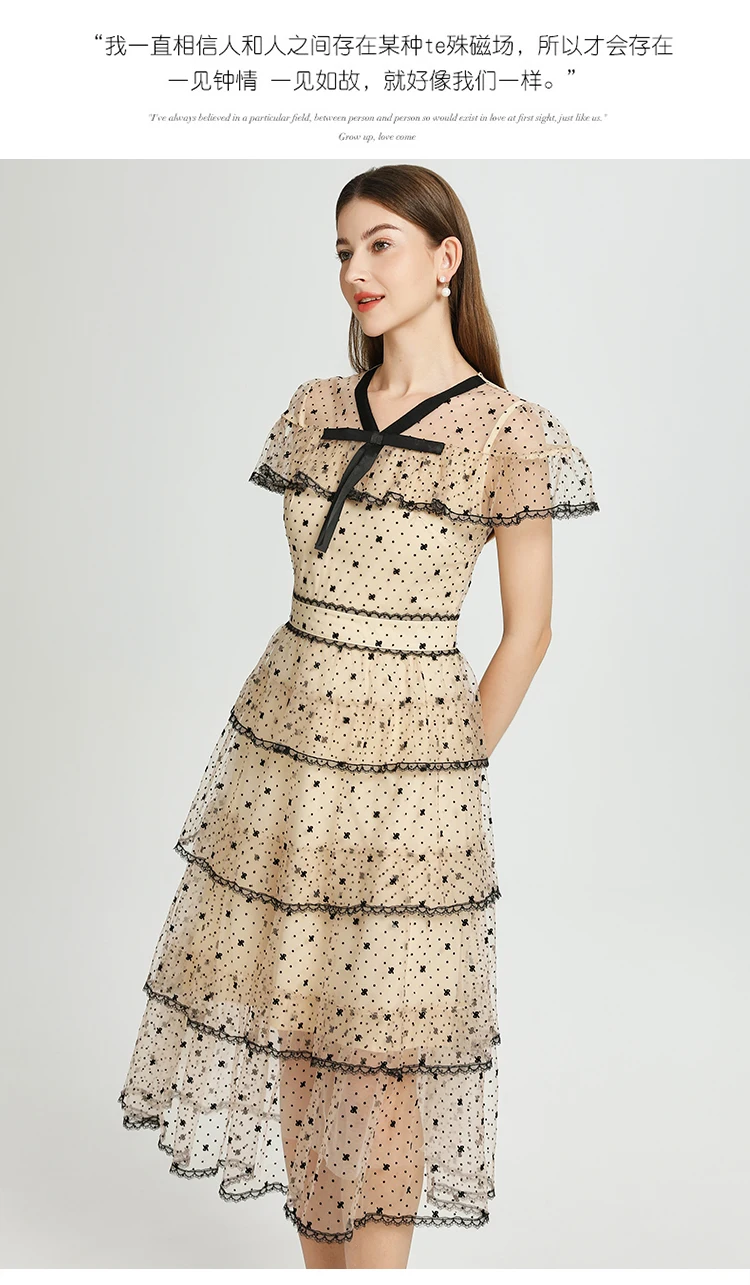 Robe vintage à pois en maille floquée pour femme, tenue d'été décontractée avec nœud papillon, col en V, manches cape et dentelle épissée