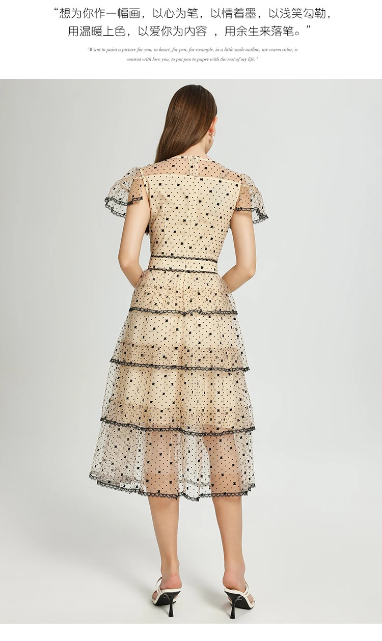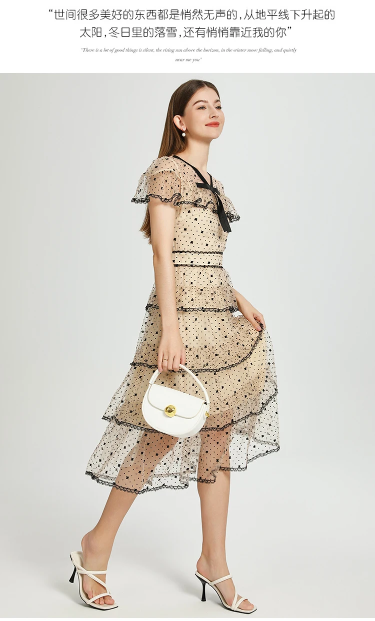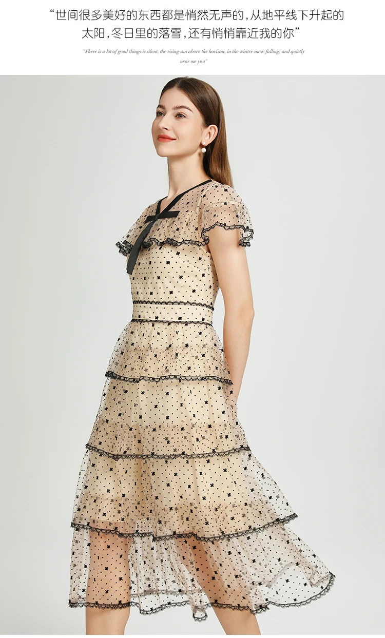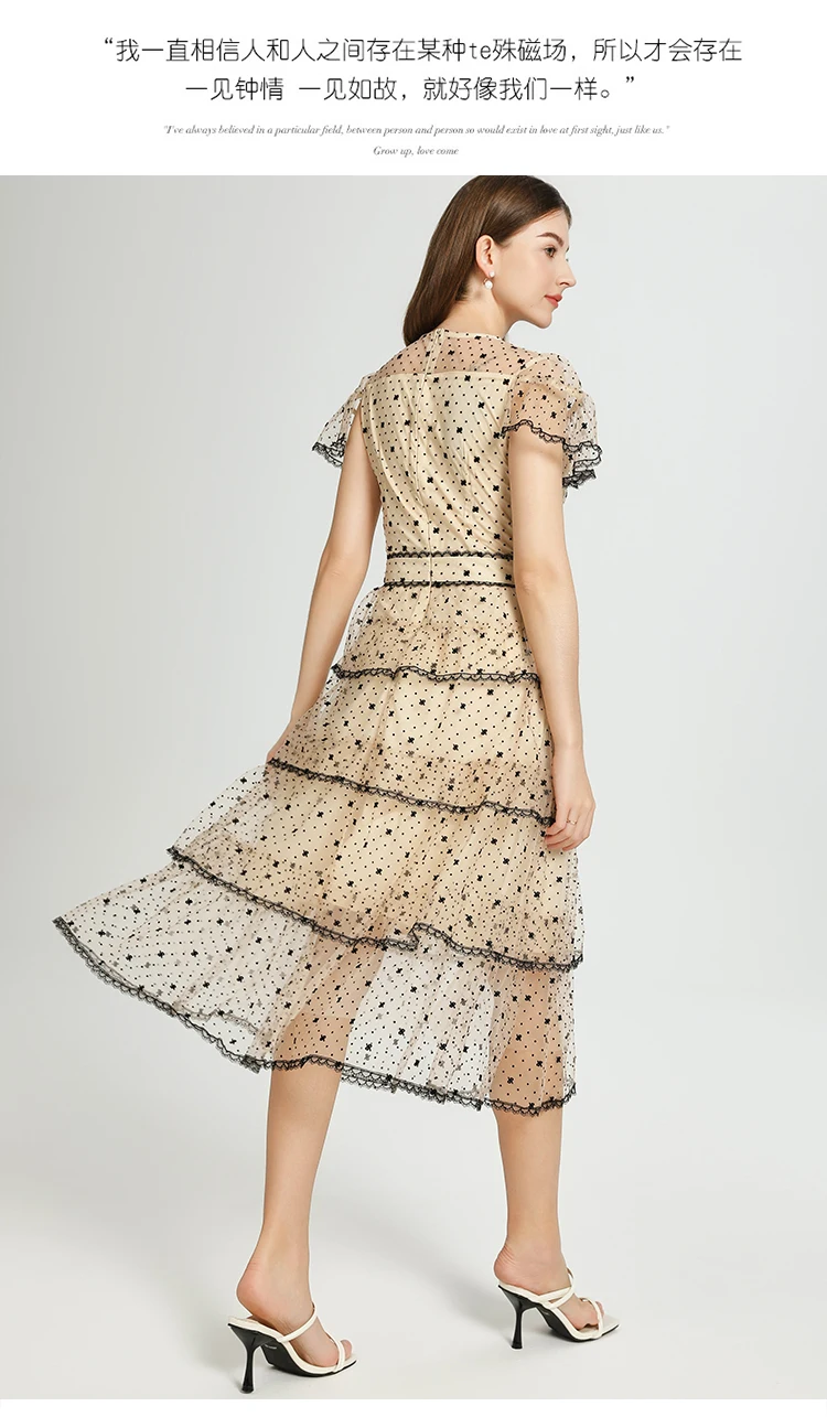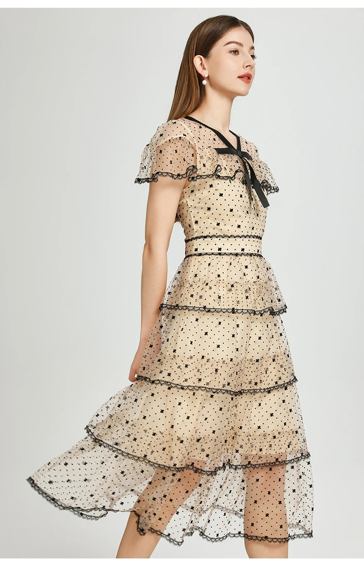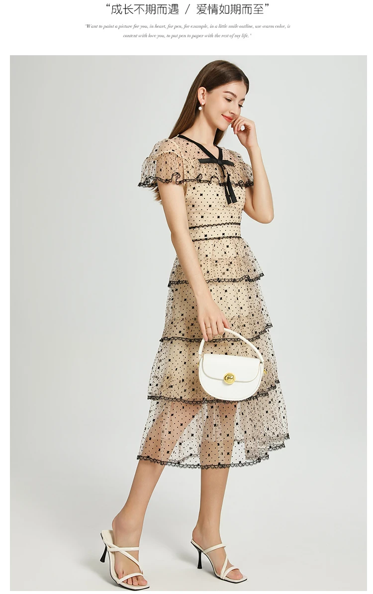 Robe vintage à pois en maille floquée pour femme, tenue d'été décontractée avec nœud papillon, col en V, manches cape et dentelle épissée