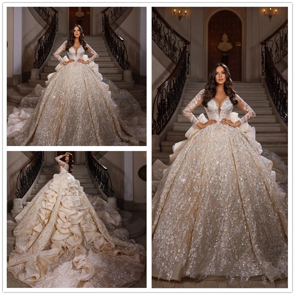 Robe de mariée de luxe à paillettes et perles, style cathédrale, à volants, manches longues, style vintage, style reine
