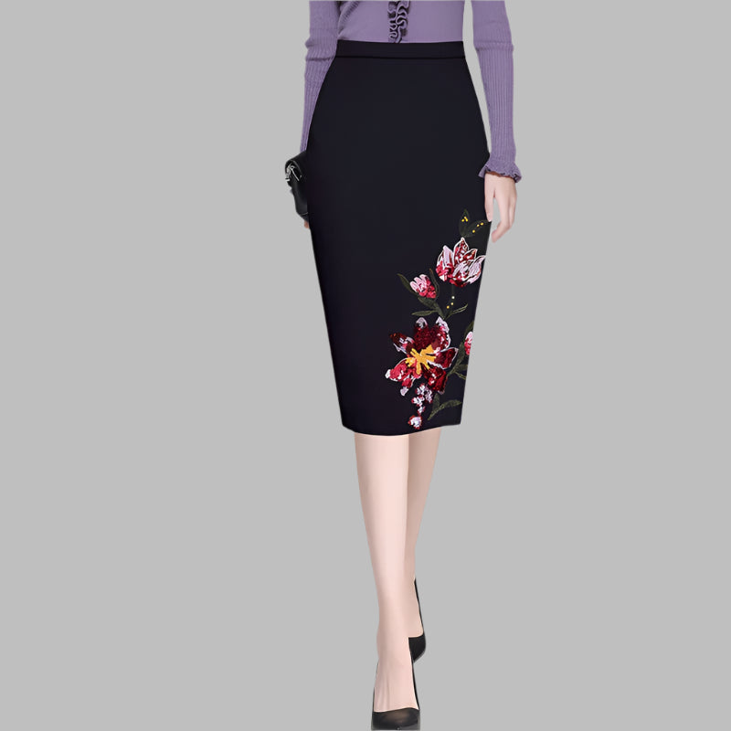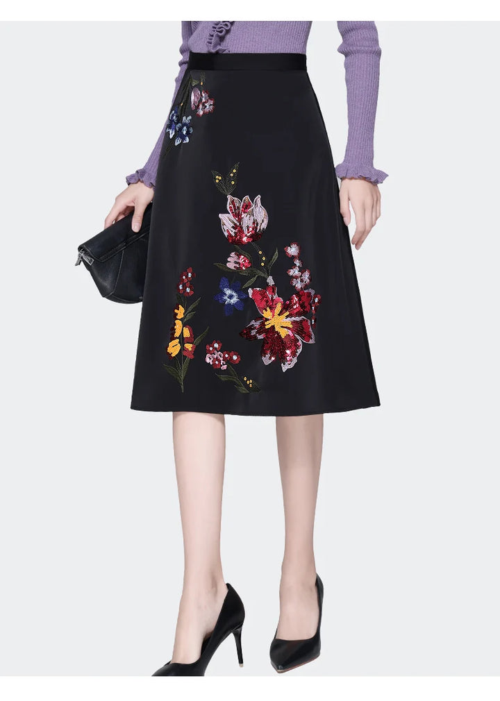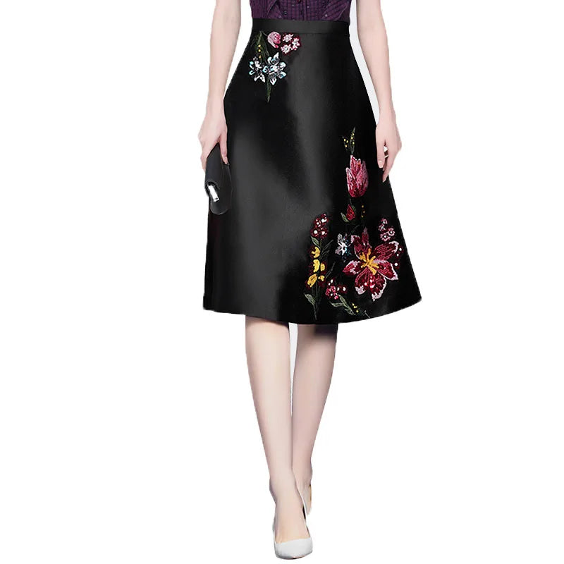 Black Embroidered A-Line Mid Waisted Skirt