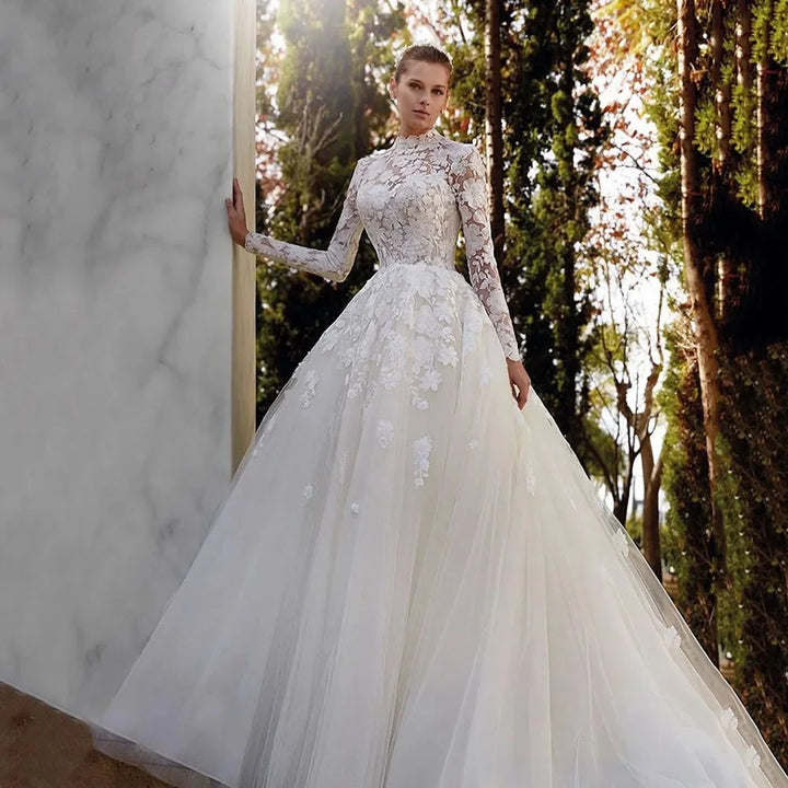 This elegant High-Neck Lace A-Line Wedding Dress features intricate lace detailing and a flattering A-line silhouette. With a high-neck cut, it offers a modern and sophisticated look for any bride. The perfect choice for a timeless and classic wedding day.