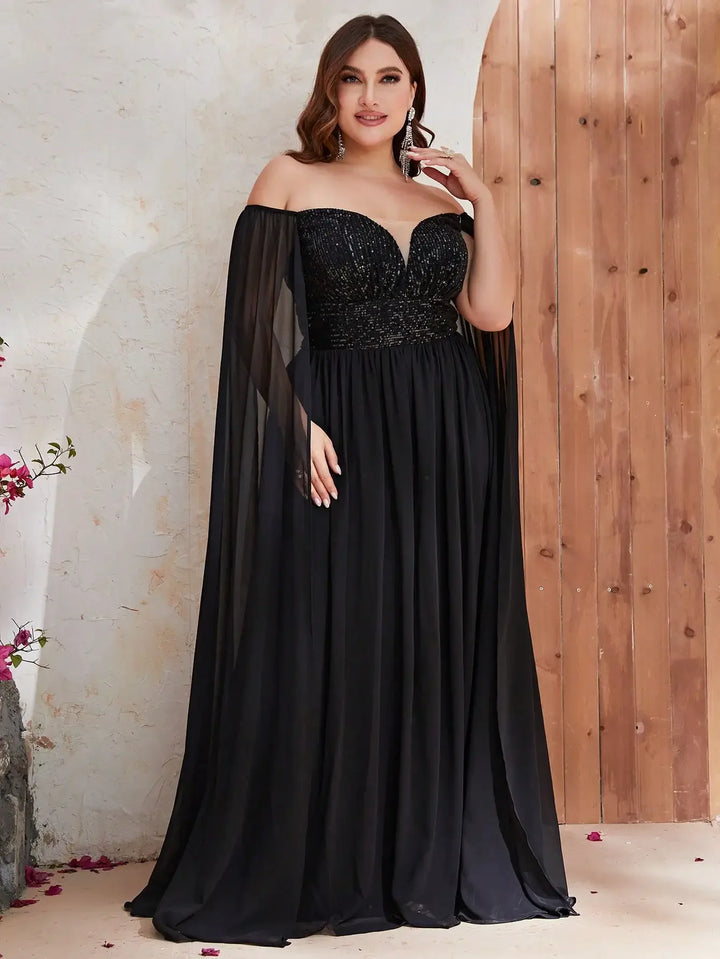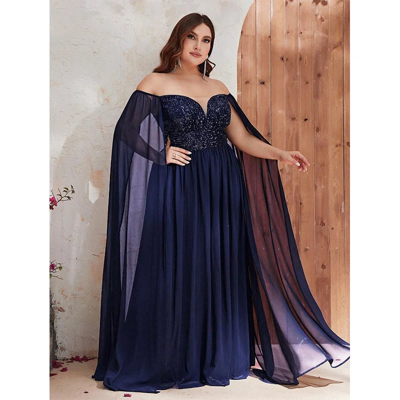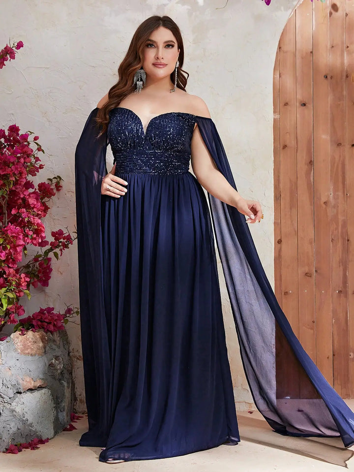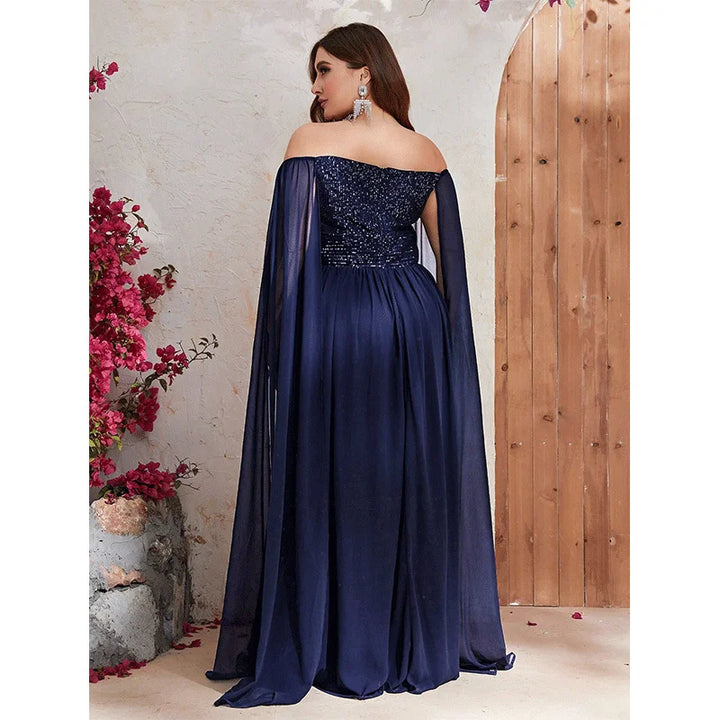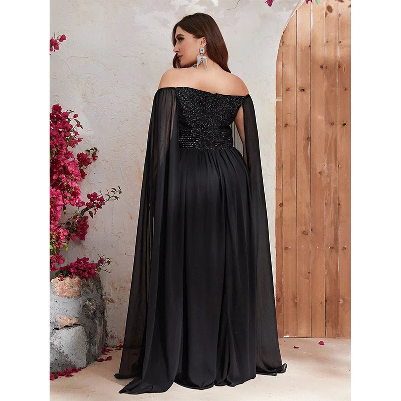 This Plus Size Off-Shoulder Cape Gown is designed to fit and flatter all body types. The off-shoulder neckline adds a touch of elegance, while the cape overlay creates a flowing and sophisticated look. Perfect for special occasions, this gown is the ultimate blend of style and comfort.
