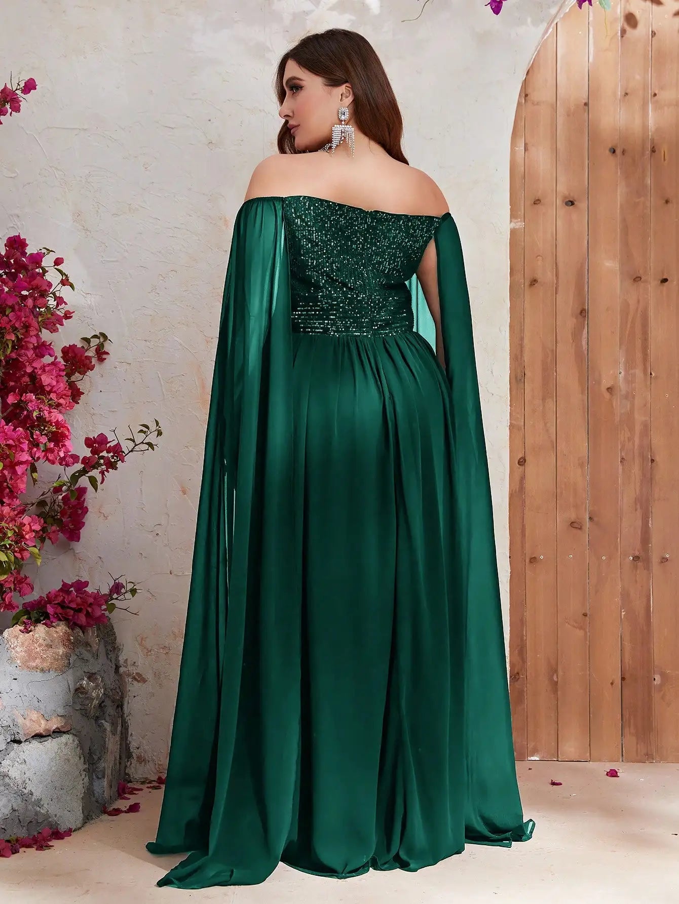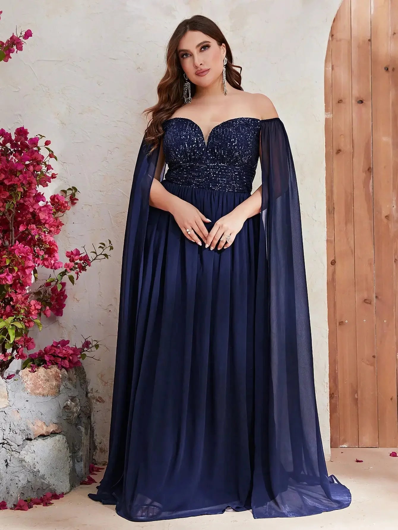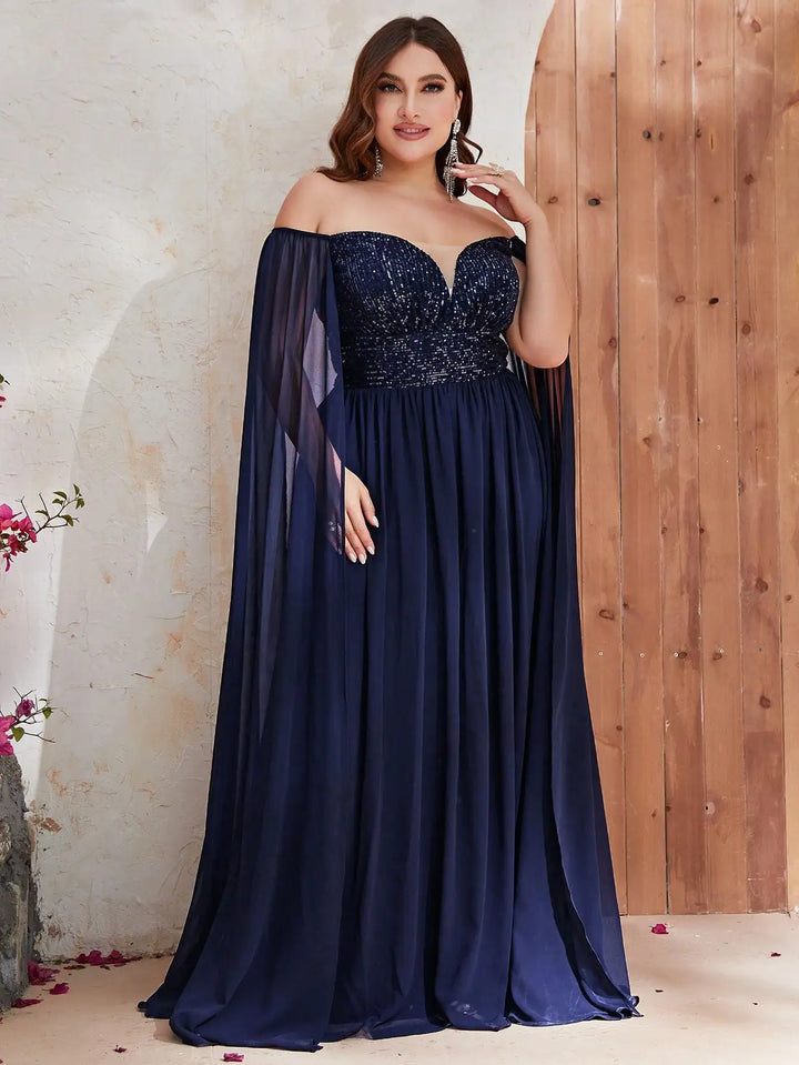 This Plus Size Off-Shoulder Cape Gown is designed to fit and flatter all body types. The off-shoulder neckline adds a touch of elegance, while the cape overlay creates a flowing and sophisticated look. Perfect for special occasions, this gown is the ultimate blend of style and comfort.