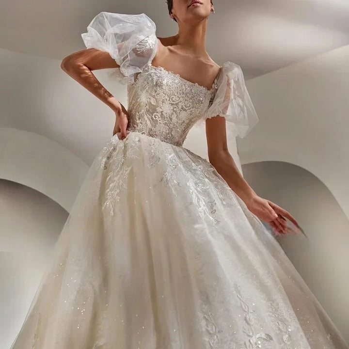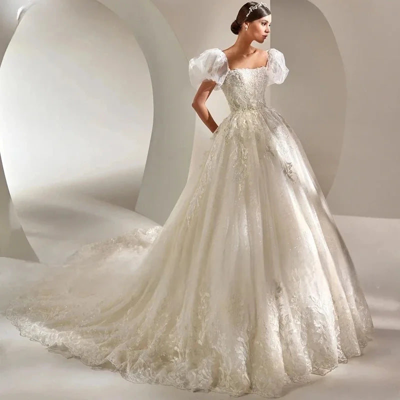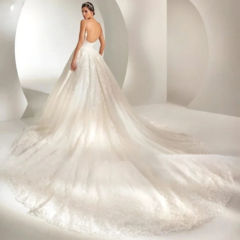 This romantic backless applique ball gown wedding dress exudes elegance and charm. With delicate handmade applique detailing, it creates a stunning and timeless look. The flattering ball gown silhouette adds a touch of femininity, making it the perfect choice for any bride looking to make a statement on her special day.