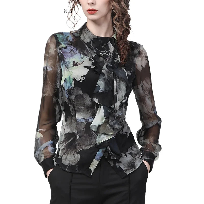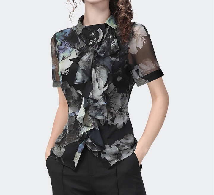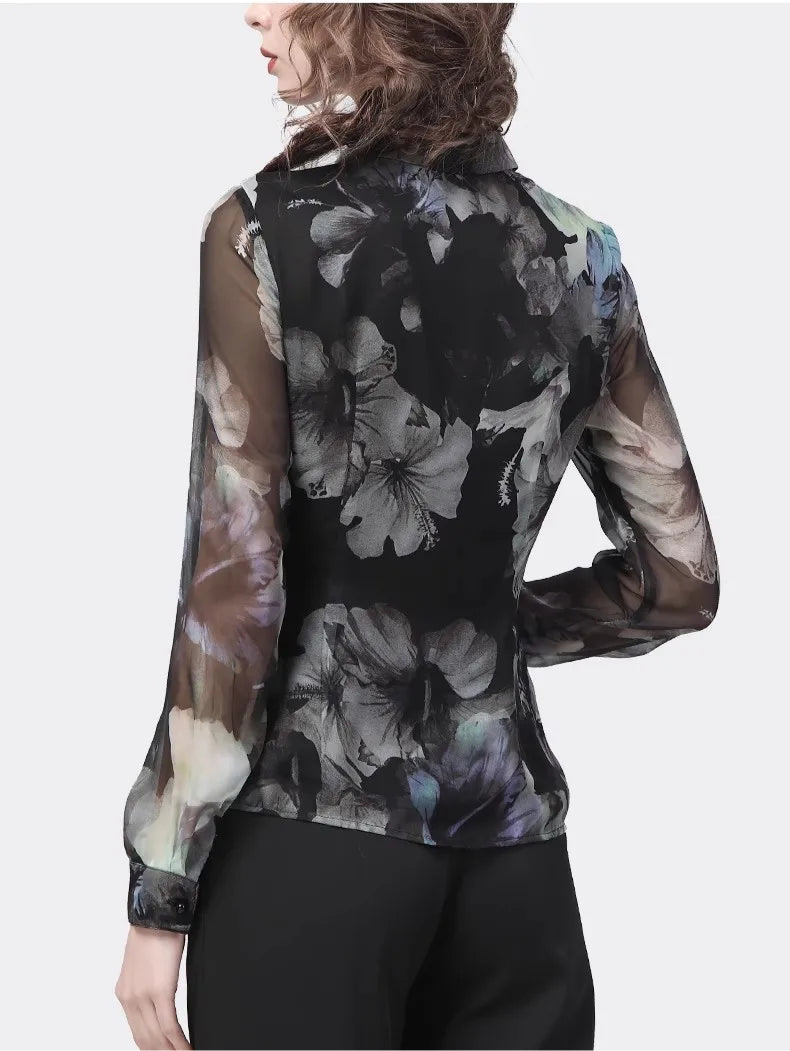 Stylish Lapel Collar Floral Blouse
